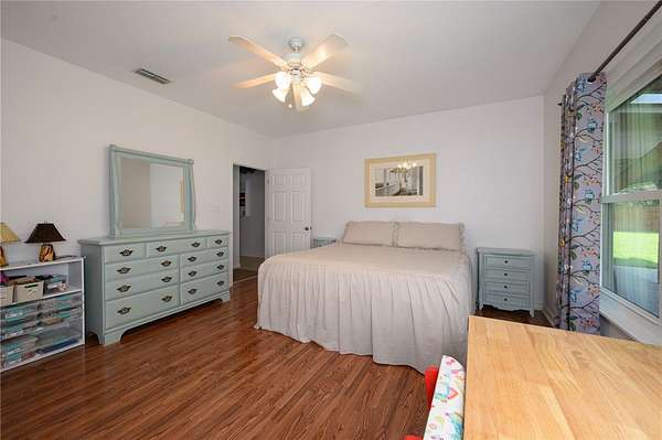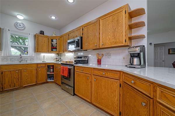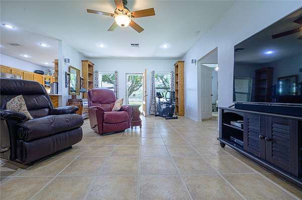 Pristine original-owner country home on two waterfront acres. Owners love birds & nature, property features a bird observation area & pond for watching/photographing birds & other wildlife. New boat dock with water & electricity. Separate metal building with garage, workshop, kitchen with water heater that owner used for game prep, fish fries. Could be converted to outside quarters. Covered RV parking on slab with hookups. Home features warm & inviting country kitchen with quartz countertops incl under-cabinet lighting, custom cabinets with charming custom rack to display platters, cake pans, etc. Tile & laminate flooring; awnings over back bedroom windows for extra afternoon shade. Two water wells with lines going to house & yard, can be switched back & forth, brand new water softener. This is a pleasant, beautifully-maintained and thoughtfully designed home and property offering a serene country lifestyle to the next owners.