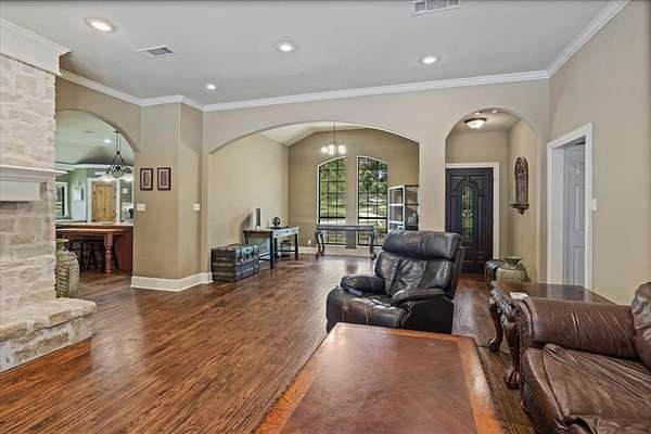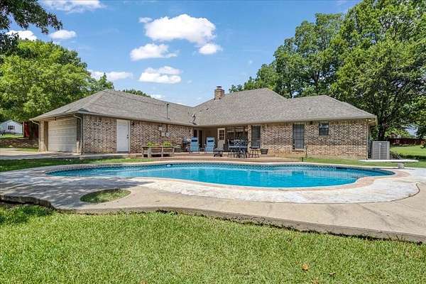 Welcome to your own private escape on 2 acres on the outskirts of west Sherman. Tucked away on a private road nestled among the trees, this home sits in the perfect country-like setting while still being inside city limits and conveniently located near FM 1417, highway 82, Sherman High School, and Pecan Grove Park. Approaching the property, you will drive through a wrought-iron private gate at the front of the long driveway that leads to this charming brick home, with a stone path leading you to the front door. Stepping inside you are greeted by plenty of natural light and large windows, tall ceilings, crown molding, and rounded archways in the main living areas. The spacious open floor plan centers around a stone wood-burning fireplace with decorative mantle and raised hearth. The bright open kitchen is perfect for a chef who loves to entertain, featuring plenty of counter space, cabinets for storage, built-in open shelving, granite countertops, stainless steel appliances, and centered kitchen island. The bedrooms feature recessed ceilings and home includes three full bathrooms. The primary bedroom hosts an ensuite bathroom with separate shower, large tub, and dual sinks. Step out to the backyard and escape to the expansive patio and in-ground pool, a cool reprieve from the Texas summer heat! The large backyard is home to several large mature oak trees, while also leaving plenty of space to run and enjoy the outdoors. The additional red barn storage shed is convenient for outdoor tools and equipment. Just a short walk will take you to Sherman's Pecan Grove Park & Athletic Complex. Sherman ISD has recently re-zoned this area to be included in the new Parker Elementary School zone. Don't miss your opportunity own a 2-acre slice of country living in west Sherman! Call your favorite Realtor and schedule your viewing today - must see in person to appreciate!