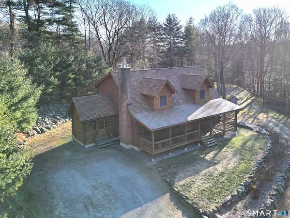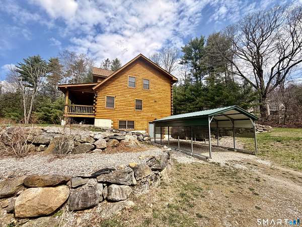 Experience the beauty and privacy of this pristine log home set on 16.53 picturesque acres. A long, level gravel driveway welcomes you to the expansive 43' x 8' covered front porch, the perfect place to enjoy breathtaking winter sunrises overlooking your own blueberry bushes. Surrounded by abundant wildlife, this property offers a true country retreat. Inside, you'll find soaring ceilings, a stunning stone fireplace ideal for holiday gatherings, and a spacious first-floor primary suite. The second floor features two large bedrooms with high ceilings, a loft, and a full bath. The eat-in kitchen opens to a mudroom with additional pantry and closet storage. The walkout lower level offers even more potential living space. Utility features include two oil tanks, a wood furnace capable of heating the entire home, a new high-end pellet stove insert, and a generator hookup at the rear of the home. Three outbuildings provide ample room for all of your equipment, recreational vehicles, and storage needs.