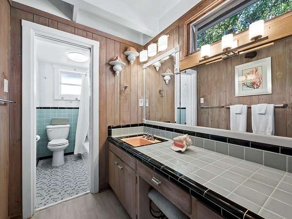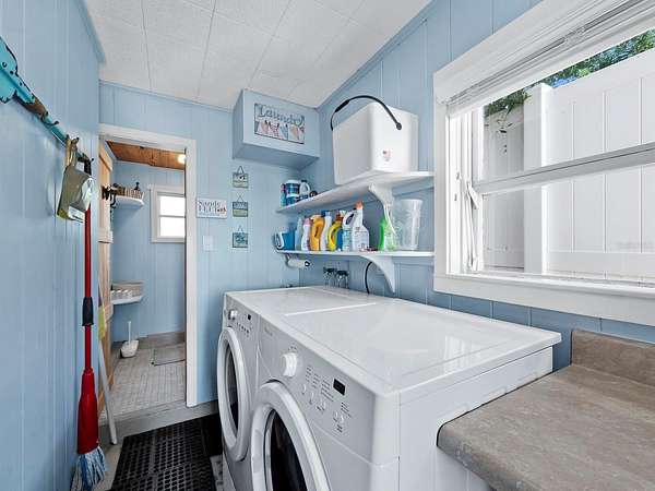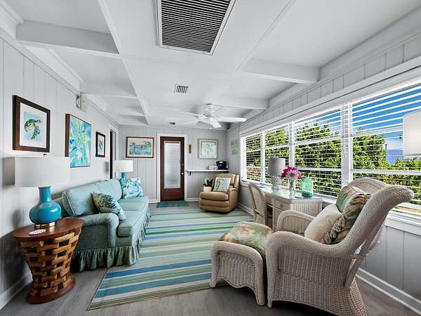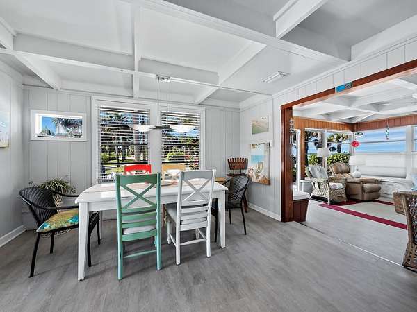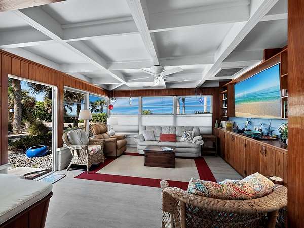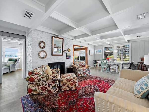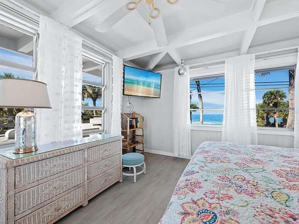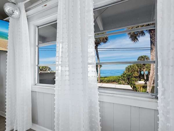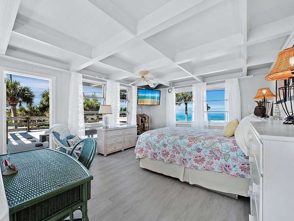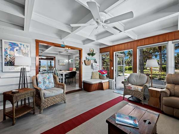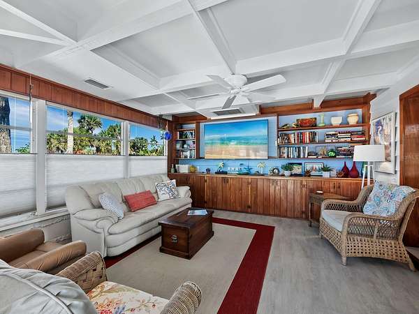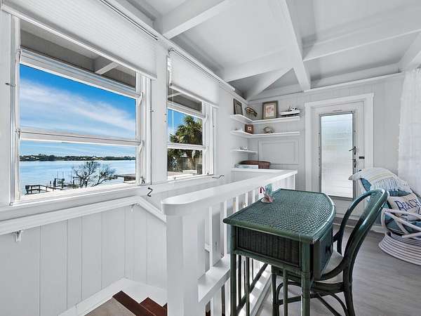 The property includes a charming vintage 1951 beach cottage featuring pecky cypress siding, a brick fireplace, and an elevated split-level design reminiscent of classic Old Florida style. The home offers two bedrooms, two full baths, plus a third bath with shower located in the laundry room. A rooftop deck provides sweeping Gulf-to-Bay vistas. Recent improvements include two new AC units (2024), a roof replacement (2015), and new garage doors. The elevated structure remained dry during recent storms.