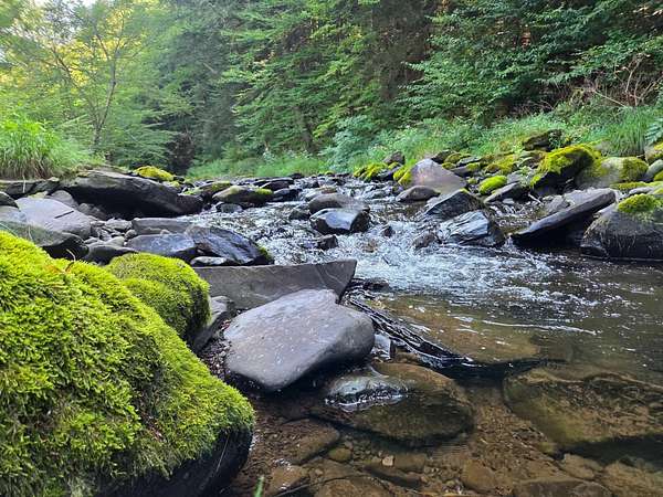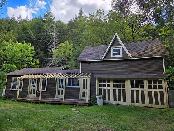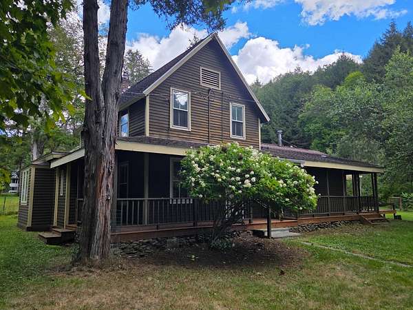 Charming c. 1920s 3 bedroom, 2 1/2 bath streamside farmhouse with carriage house on 1.63 landscaped and fenced picturesque acres just minutes from the Village of Fleischmanns with its trendy cafes, bistros, galleries, museum, shops, village ballpark, swimming pool & tennis courts. And only 5 minutes to Belleayre Mountain's skiing and popular festivals. This antique 1,753 square foot home with a contemporary wing blends the best of both worlds. The bright and airy 15' x 20' living room with tongue & groove pine plank cathedral ceiling with ceiling fan has an Encore Defiant airtight woodstove with slate hearth and French doors that open onto a 10' x 20' deck with pergola and wraparound porch with the relaxing sound of the Vly Creek - only steps away. Cool off by splashing around in the creek's swimming hole or catch your own trout for dinner! The spacious 12' x 21' cook's kitchen has a propane gas range, handsome quarry tile floor, ample marble tile counters and a center island breakfast bar. There's an 8.5' x 10.5' dining room with sliding pocket doors and an 8' x 10' den or home office. A French door leads to the front hall with a half bath, a 7' x 10' main level bedroom, a ceramic tile floor oversized shower stall bath with cathedral ceiling and skylight. There's also a closet with washer and dryer and a utility room that houses the well pressure tank and a new 40-gallon electric hot water heater. A wood staircase leads to the second floor two bedrooms - an 8' x 10' guest bedroom, a 10' x 15' primary bedroom with 2 skylights and an antique bath with a claw-foot tub. The 2-bay carriage house has an upstairs 9.5' x 13' room in original condition, plus a 19' x 28' 4-room addition with running water, electric & heat, and a 9' x 14' deck overlooking the stream - an ideal space for guests or a wonderful potential studio space. Total taxes: $3,812. Arrange your viewing before it's gone!