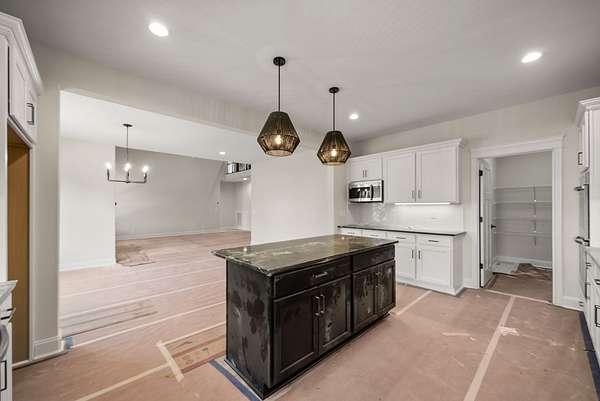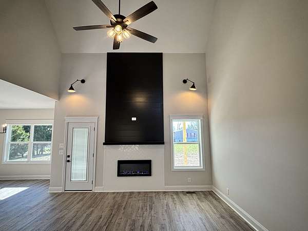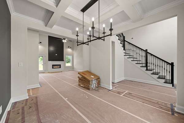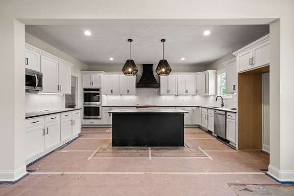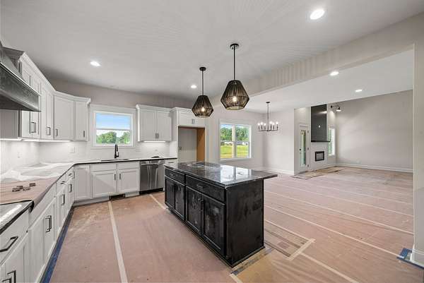 Step inside to an open-concept floor plan featuring vaulted ceilings and a cozy fireplace, creating a bright and inviting main living area. The kitchen is designed for both style and function with an oversized island, abundant cabinet space, sleek black finishes, and modern fixtures.