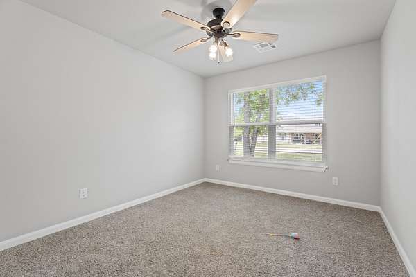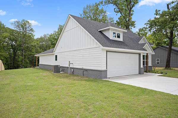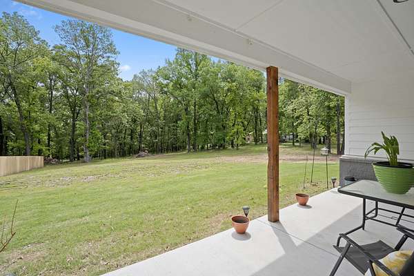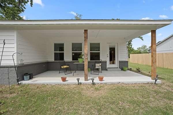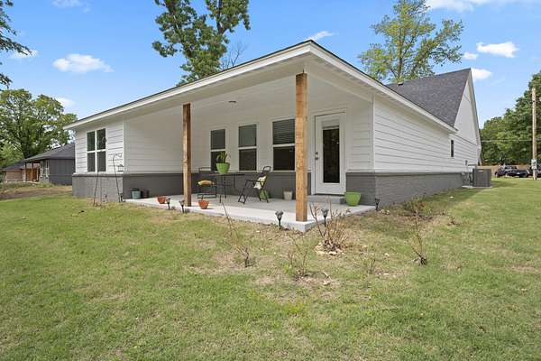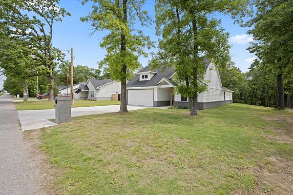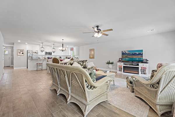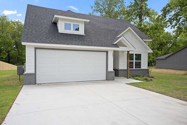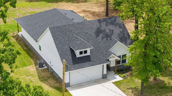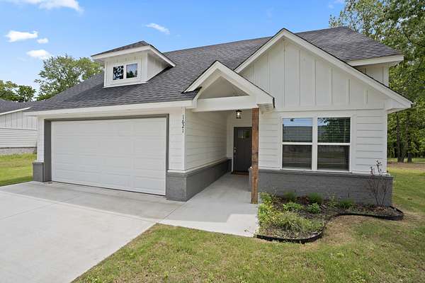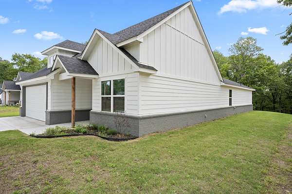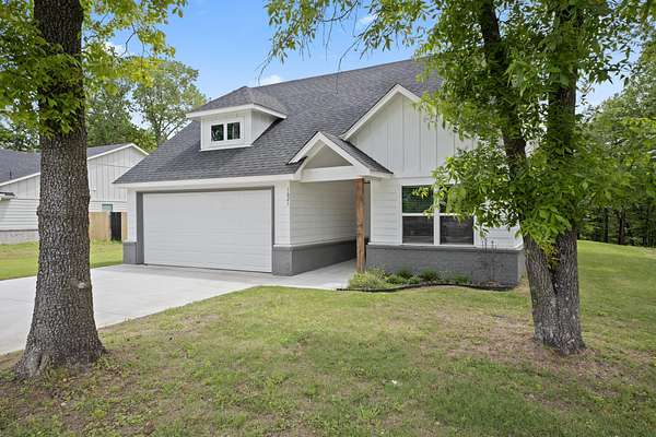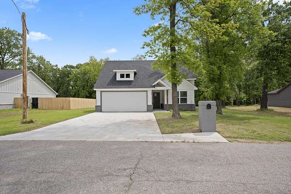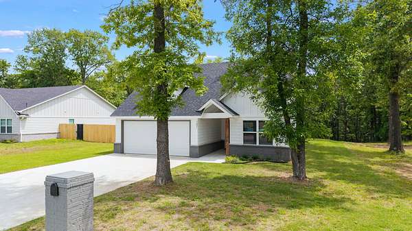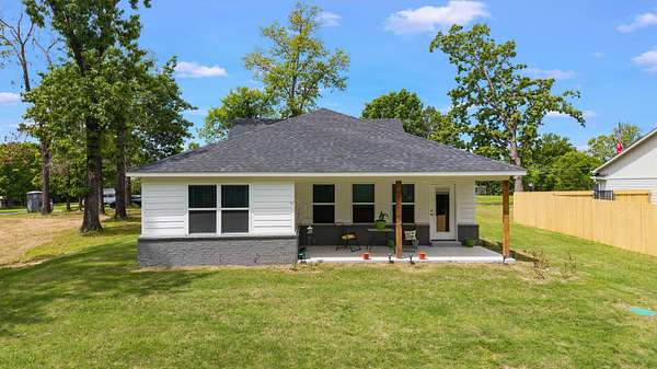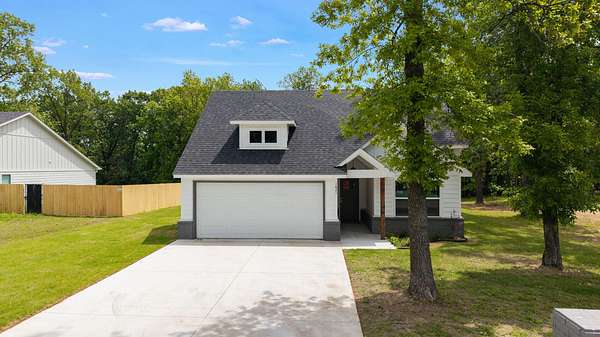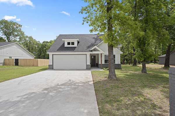 Built in 2024, this 3-bedroom, 2-bathroom home features a large open split floor plan with modern finishes and quality construction. The kitchen features granite countertops, stainless steel appliances, and a new refrigerator. A washer and dryer are also included. The main living areas are finished with ceramic tile flooring, while the bedrooms feature carpet. Modern fixtures are found throughout, and energy efficiency is highlighted with spray foam insulation on all exterior walls and a tankless hot water heater. The exterior combines cement siding and brick, with a covered back patio overlooking the spacious, tree-lined lot. Conveniently located just minutes from shopping, dining, medical facilities, and Grand Lake.