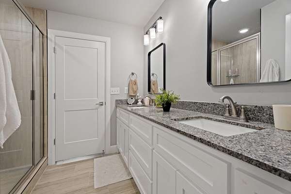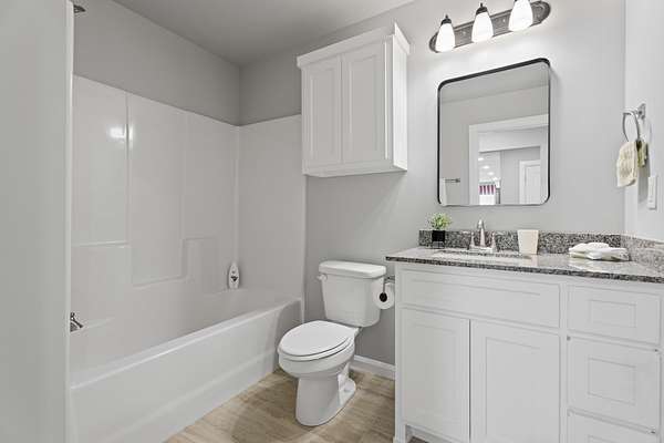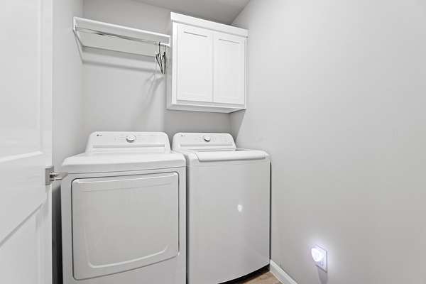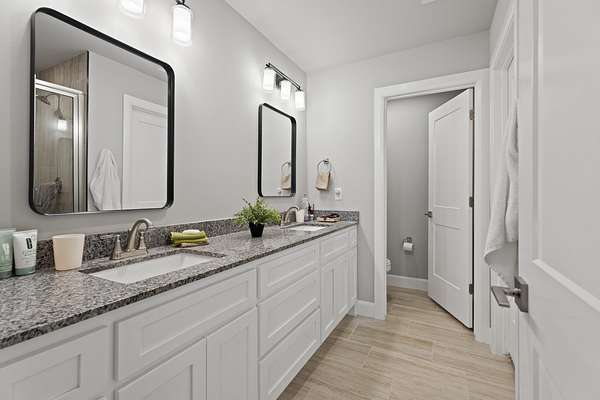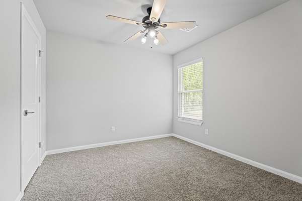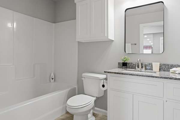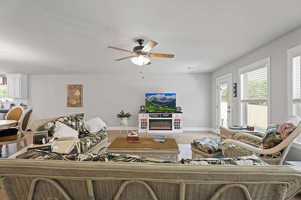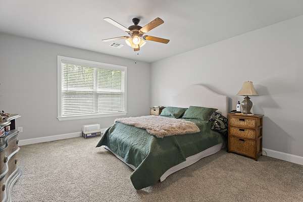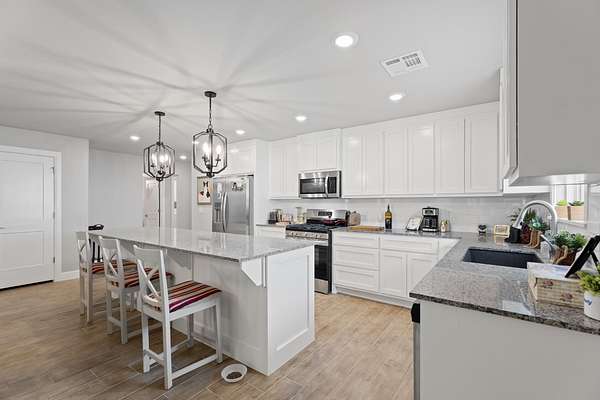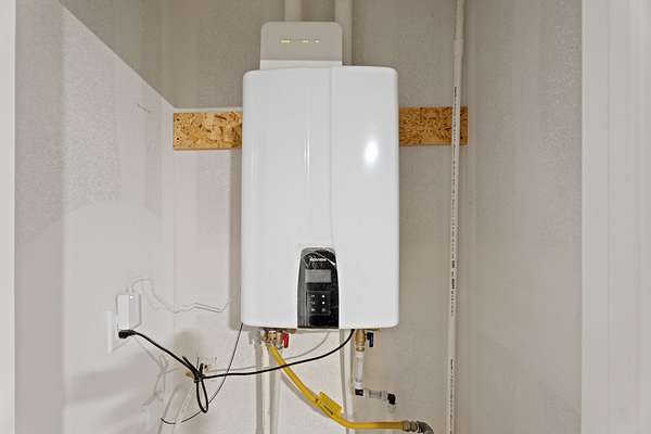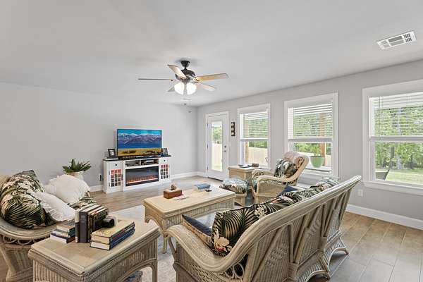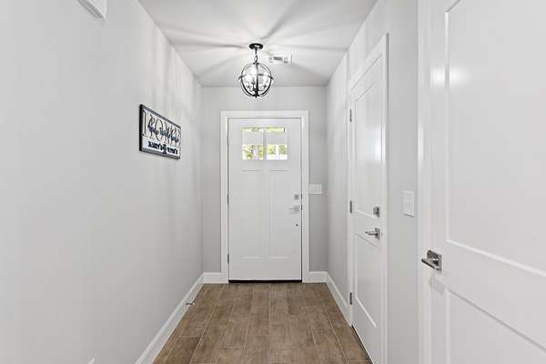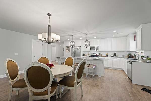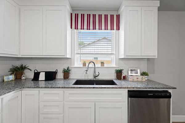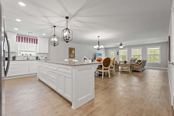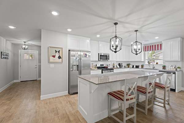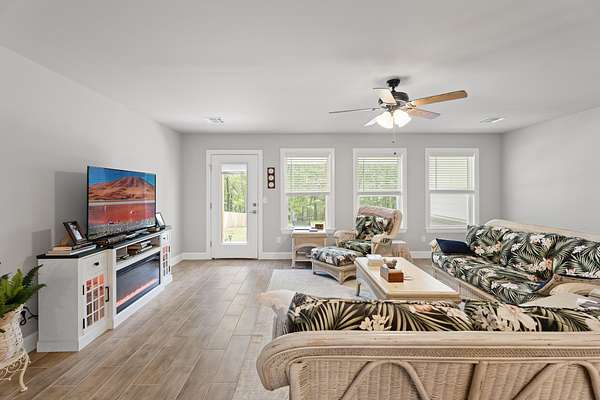 Built in 2024, this 3-bedroom, 2-bathroom home features a large open split floor plan with modern finishes and quality construction. The kitchen features granite countertops, stainless steel appliances, and a new refrigerator. A washer and dryer are also included. The main living areas are finished with ceramic tile flooring, while the bedrooms feature carpet. Modern fixtures are found throughout, and energy efficiency is highlighted with spray foam insulation on all exterior walls and a tankless hot water heater. The exterior combines cement siding and brick, with a covered back patio overlooking the spacious, tree-lined lot. Conveniently located just minutes from shopping, dining, medical facilities, and Grand Lake.