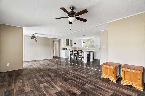 Just beyond, the doublewide mobile home offers three bedrooms and two baths, an open floor plan, luxury vinyl flooring, and a spacious kitchen complete with an island and all appliances--ideal for extended family, guests, or rental income.