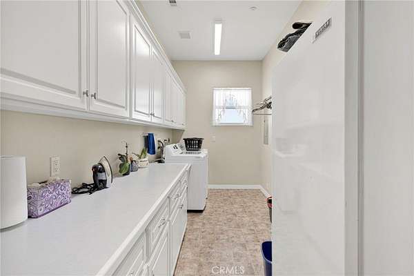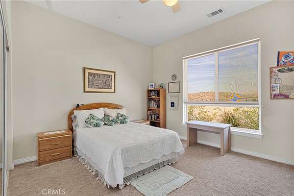 The huge primary suite includes a walk-in closet, separate jetted tub, and walk-in shower, along with its own large slider offering the same stunning desert and evening city light views. Secondary bedrooms are generously sized. Additional highlights include a large indoor laundry room and water softener.