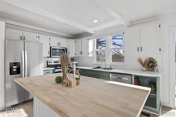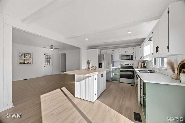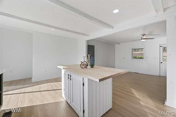- Beamed Ceilings, Ceiling Fan(s), Double Vanity, Eat-In Kitchen, Kitchen Island, Master Downstairs, Open Floorplan, Pantry, Recessed Lighting, Separate Shower