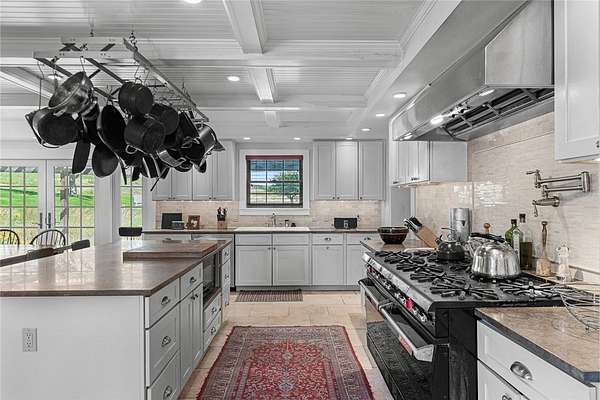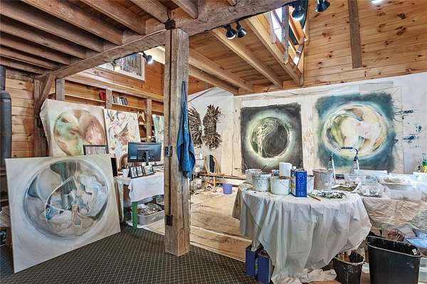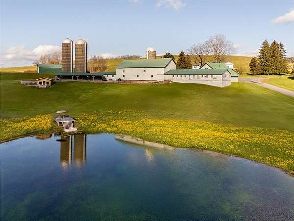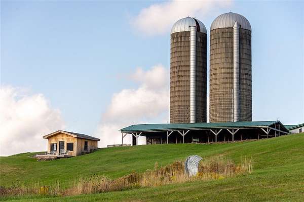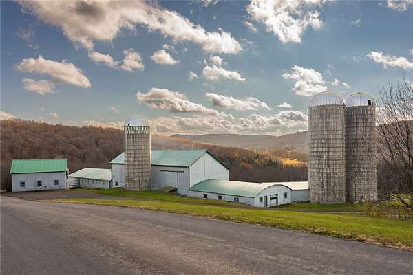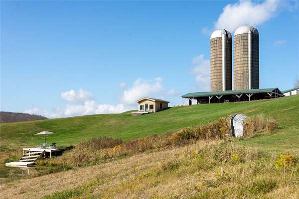 Set on 102+ pristine acres in the heart of Franklin, New York, this exquisitely restored Greek Revival farmhouse blends timeless architecture with refined modern comfort. The main residence offers five bedrooms, four full baths, and one half-bath, including three ensuite bedrooms and a private two-bedroom guest suite. A bright, open-concept kitchen and dining area features a chef's kitchen with a 10-burner gas range, dual ovens, a large granite island, walk-in pantry, and a wood-fired pizza oven. The formal living room, anchored by a striking fieldstone fireplace, opens to a cozy library annex. A handsome office sits conveniently between the kitchen and main foyer, while a spacious media room, two mudrooms, a laundry room, and an attached two-car garage complete the first floor. The primary suite features a wood-burning fireplace, generous closet space, and a luxurious bath with a soaking tub and separate shower. A second primary suite offers a steam shower and adjacent office or study. The third ensuite bedroom enjoys private access via a secondary staircase to the lower level. Two additional guest bedrooms share a well-appointed bath on the second floor. Across a quiet country road sits a restored saltbox artist studio, showcasing hand-hewn beams, a wood-burning fireplace, and a vaulted upper level. The first floor includes a powder room, while the upper level offers an exercise and entertainment area. A classic two-story dairy barn houses a heated workshop, the original milking parlor, and a spacious hayloft. Outfitted with three-phase electric and water service, the barn-along with the main house and artist studio-can be heated by a central wood-burning furnace. Three large, intact silos frame the barn, and a sizable pole barn provides additional storage and yet another wood-burning stove. The grounds are as functional as they are picturesque, featuring sweeping open hay fields, wooded areas, a spring-fed pond, a meandering stream, and numerous walking trails. The pond, recently expanded and enhanced, includes a newly built pond house with a floating deck that offers the perfect vantage point to enjoy the serene landscape.