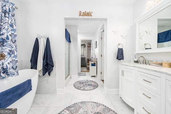 - Beamed Ceilings, Double Vanity, High Ceilings, Master On Main Level, Soaking Tub, Tile Bath, Tray Ceiling(s), Vaulted Ceiling(s), Walk-In Closet(s)