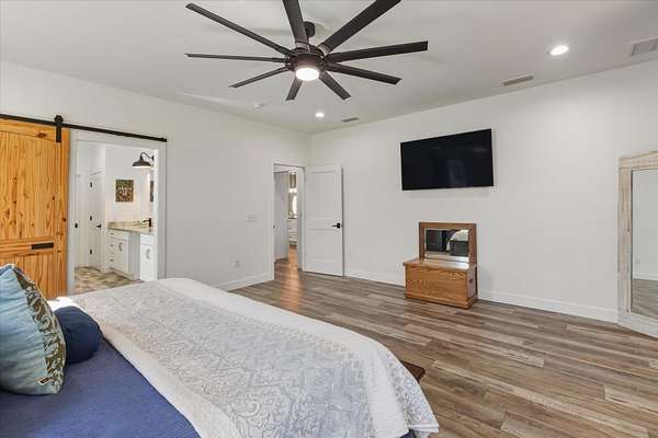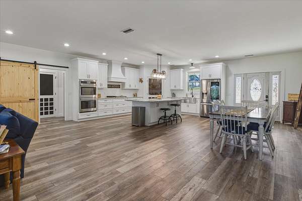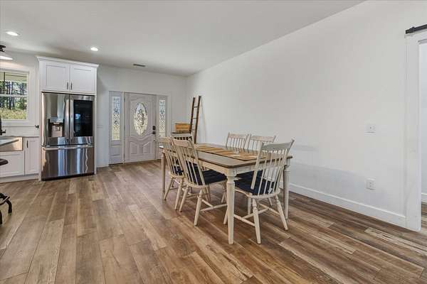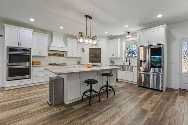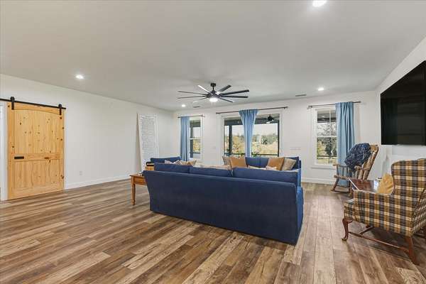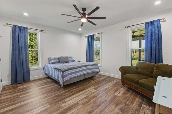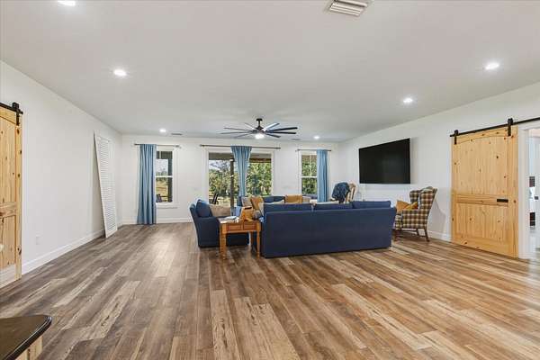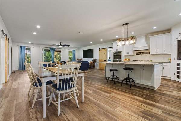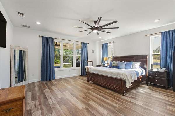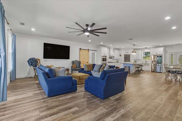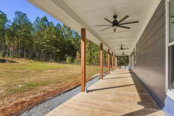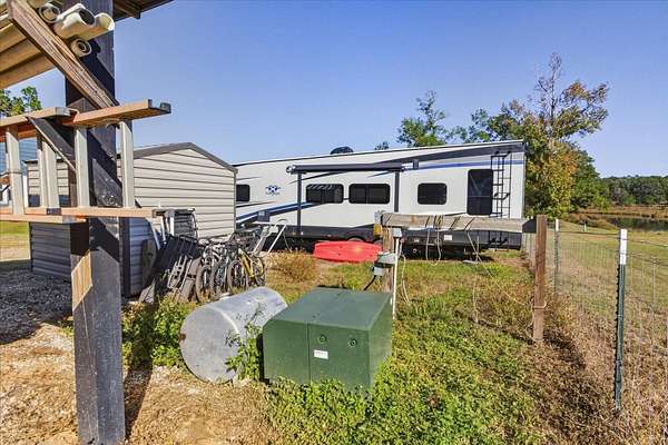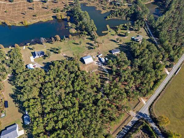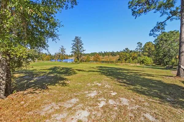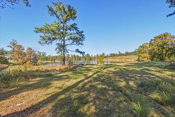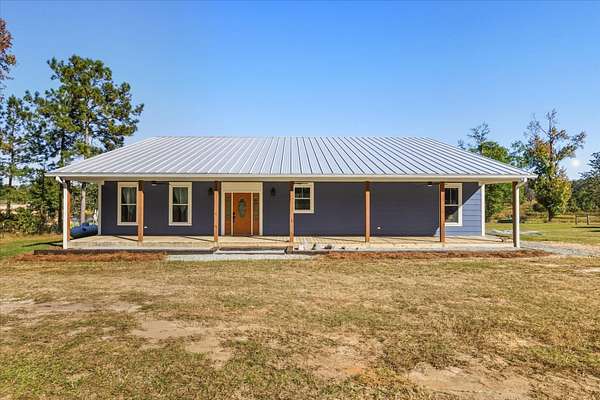 Enjoy the gorgeous water views from the porch of this like-new, 2022 built home! A Gated driveway leads to your 5 acre parcel on a beautiful 10 acre spring-fed lake with great fishing. 6 ft windows and 8x8 sliding doors allow the open living, dining, and kitchen areas to view the sunny outdoors. Kitchen features a large island with seating area, stainless appliances, gas stove, and fridge with dual ice maker. Living spaces spill over onto the covered front porch, and screened back porch. Primary suite includes a huge 8x18 closet, spacious bathroom with double sinks, large walk-in shower, tub, and separate toilet area. Almost entire attic space is floored for lots of additional storage. 20x20 insulated workshop with electricity, hot water, mini split AC, and loft area for storage and outdoor projects, plus an additional shed with power, and an RV hookup. 2 tankless water heaters. LVP floors throughout. Standing seam metal roof.