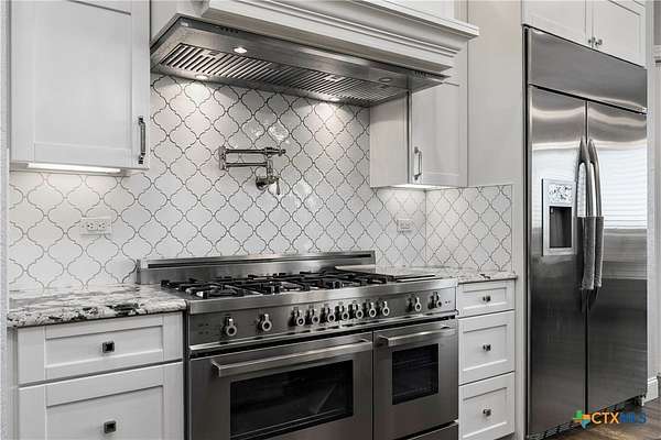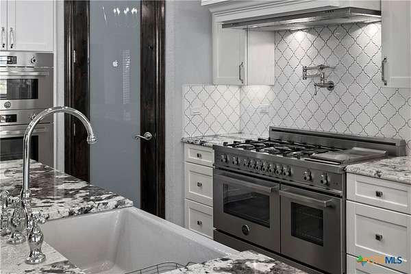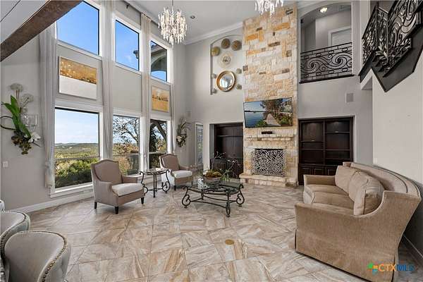 Set upon a private hilltop in Bulverde, this impressive Hill Country retreat features 8.64 unrestricted acres and delivers outstanding long-range views. Boasting a luxurious blend of comfort, elegance and modern chic, this one-of-a-kind jewel is a must see! A grand arrival up the private drive leads to an interior defined by soaring ceilings, exquisite architectural detailing, stunning chandeliers and sweeping panoramic views. The heart of the home is the extraordinary gourmet kitchen appointed with top-of-the-line imported Italian appliances, custom cabinetry, and a generous statement-making granite island designed for gathering and entertaining. The lavish primary suite is located on the main level and boasts a spacious walk-in closet, a spa-like en-suite bathroom with a deep soaker tub, double sinks and glass enclosed shower. A media room, dedicated office and oversized laundry-room complete the main level while the upstairs offers 4 large bedrooms, 2 full bathrooms, and a balcony overlooking the pool. The resort-style backyard is a world of its own. A heated beach-entry pool and spa, dramatic waterfalls, a slide, a rock cove, an outdoor fireplace and multiple grilling stations deliver the ultimate outdoor lifestyle experience. Separate living quarters above the 3-car detached garage ideal for multi-generational living. No HOA. Flexible use. Award winning Comal Schools. Smithson Valley High School. Convenient to Boerne, Gruene, New Braunfels and Canyon Lake. Minutes to the San Antonio International Airport. This is more than a home. It's a destination!