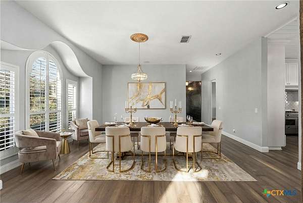- Built In Features, Ceiling Fans, Chandelier, Crown Molding, Dining Area, Double Vanity, Garden Tub Roman Tub, High Ceilings, Home Office, Main Level Primary, Multiple Closets, Multiple Dining Areas, Multiple Living Areas, Open Floorplan, Primary Downstairs, Recessed Lighting, Separate Formal Dining Room, Separate Shower, Vanity, Vaulted Ceilings