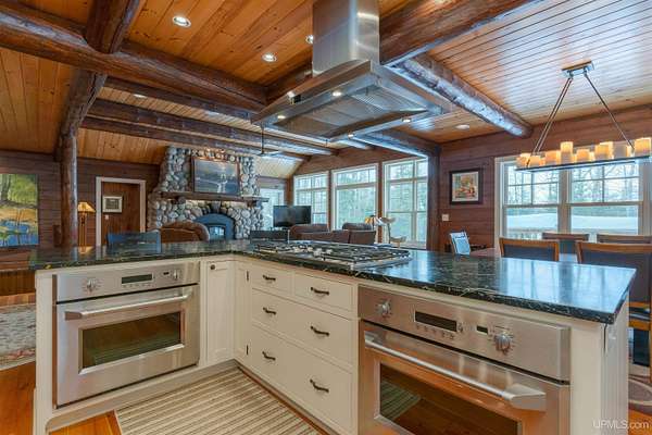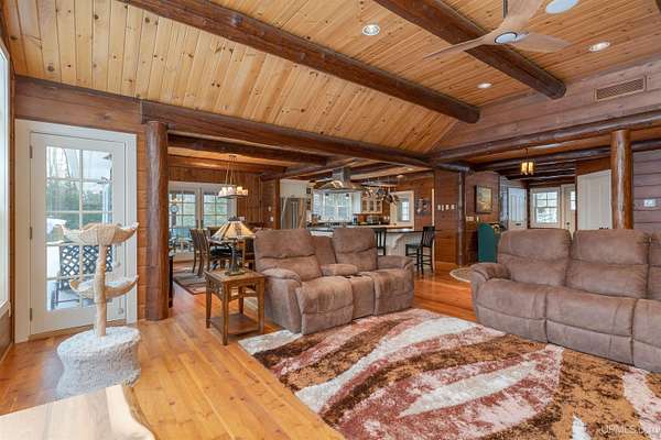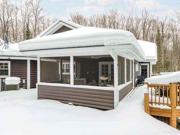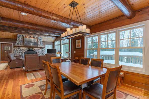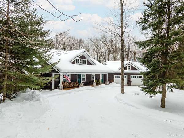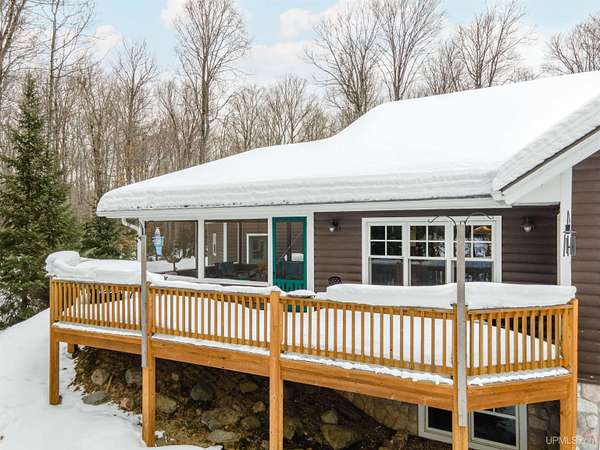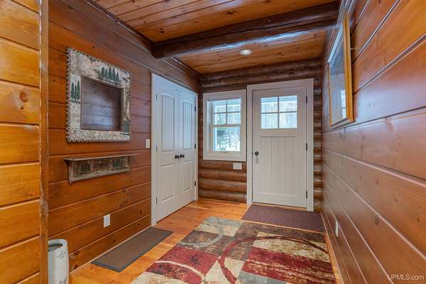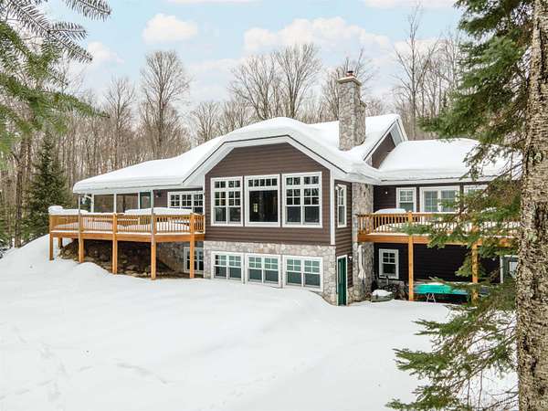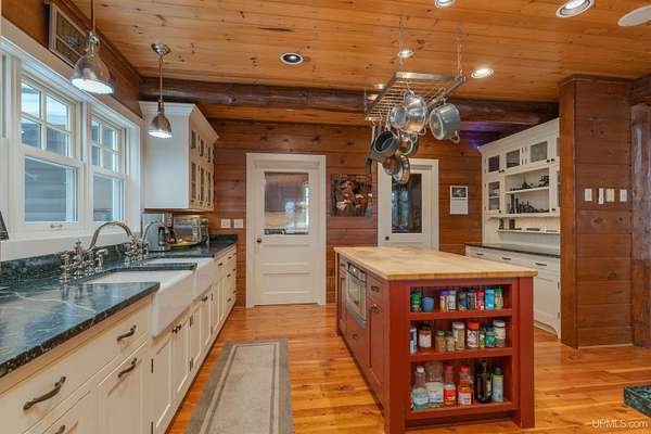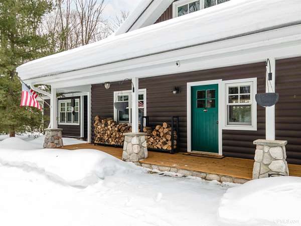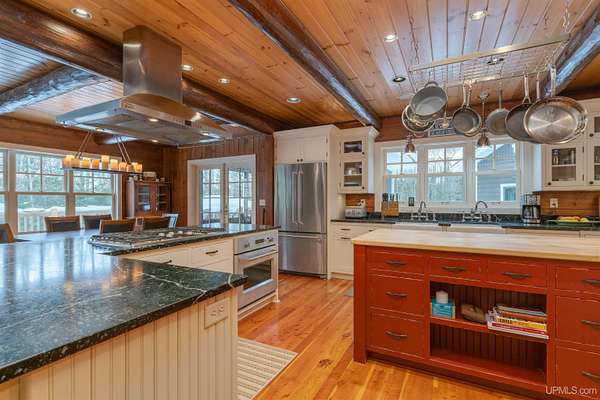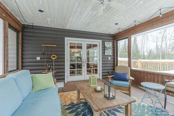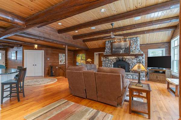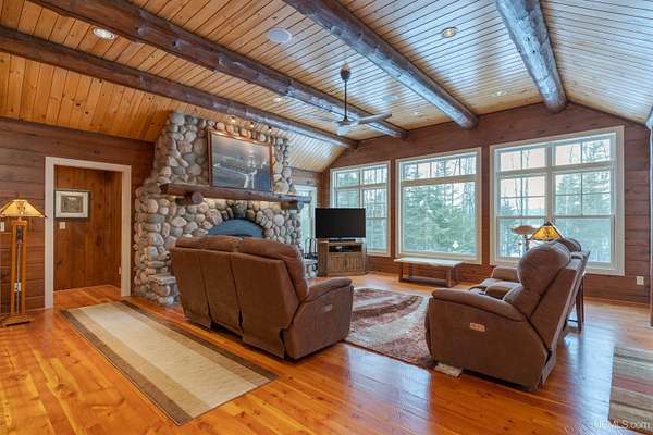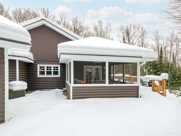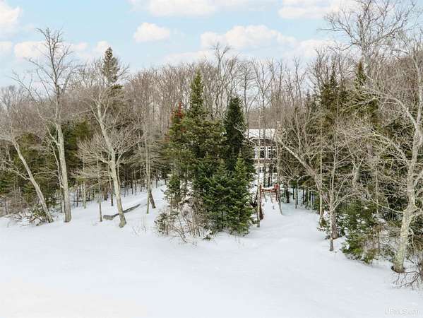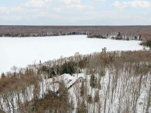 This spectacularly unique custom built 4 bedroom, 2.5 bath home on well over 5 acres was constructed with pride, passion and great attention to detail. Encompassing nearly 4,400 square feet of luxurious living space, that starts with the 2-car attached garage leading to the laundry/mud room with ample storage and half bath. From there, enter the custom kitchen that every chef would love, with soapstone countertops and plenty of room to entertain - you may never want to eat out again - plus walk-in pantry for all your storage needs. Living and dining rooms are adjacent as well as a bonus screened porch with access to the large deck that's a great place to enjoy beautiful mornings enjoying coffee or gathering for after-dinner drinks. There are 2 beautiful stone woodburning fireplaces, one on the main level and one in the family room in the walkout lower level. Log beams adorn the ceilings, and you have gorgeous hand-sawn wood floors throughout the home. There are 2 main floor bedrooms, one being a primary suite with ensuite, including walk-in tiled shower, spa bath, and dual vanity sinks. The lower level has two bedrooms with another large bath. This home even has a large walk-in sauna! The exterior is beautifully landscaped with a walking path down to the water. There are so many more amenities than your average waterfront home! 153-acre Homan Lake is a private lake and reaches depths of about 35 feet. It's also no-wake, so it's ideal for fishing, kayaking, canoeing, and swimming. Homan Lake's east shore is the serene neighborhood of "Waasanoode," the Ojibwa term for "Northern Lights." This private location displays them most beautifully across a dark, starry sky with no light pollution to detract from your view. Facing west, the residences along this shoreline have spectacular sunset views. Each parcel is spacious and deeded covenants maintain the integrity of this lake community.