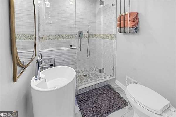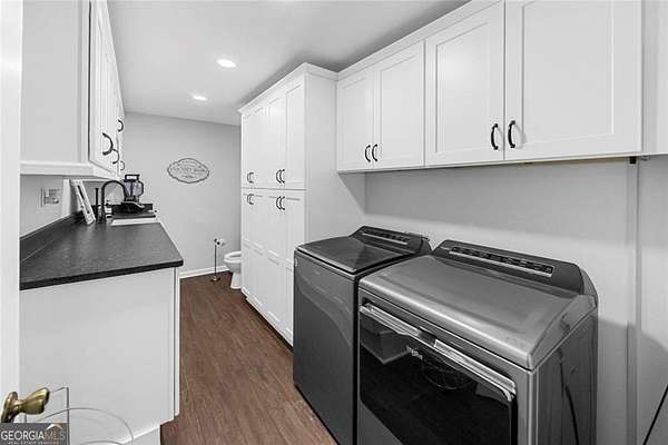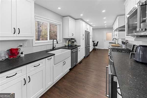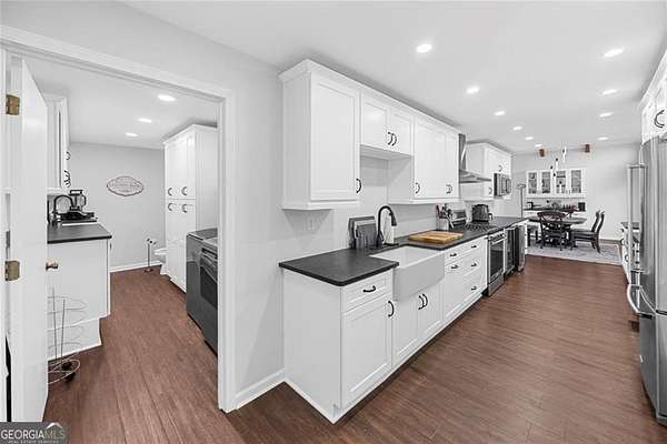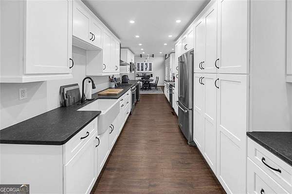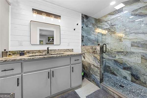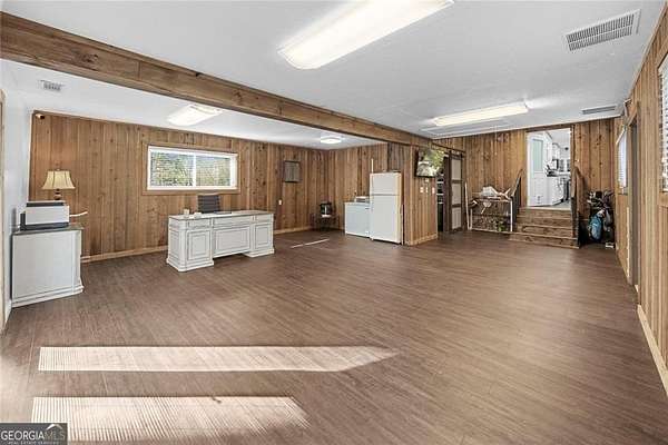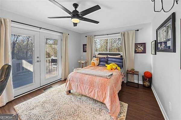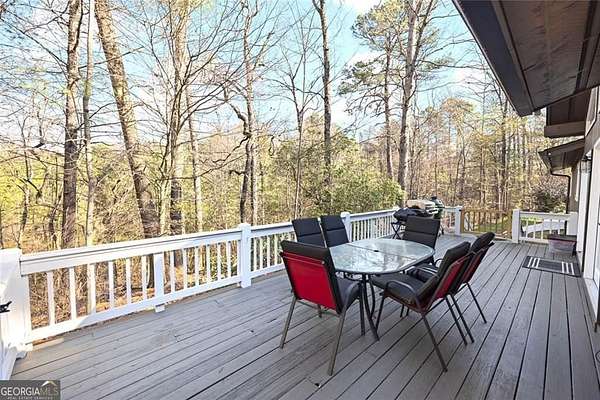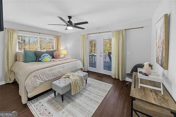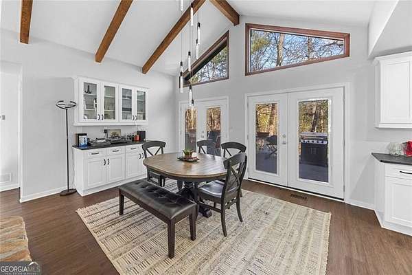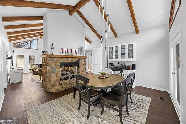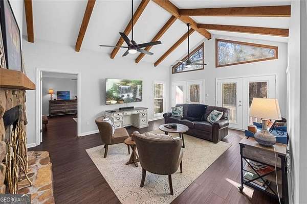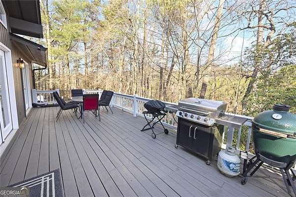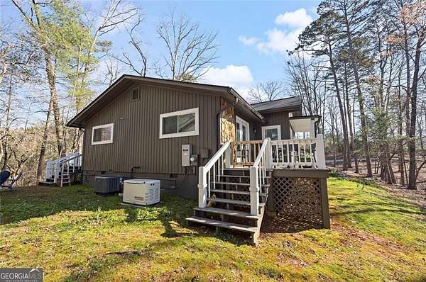 Private North Georgia retreat situated on 2+ acres in Ellijay! This 3-bedroom, 2.5-bath ranch features an updated kitchen with white cabinetry, solid surface countertops, and stainless steel appliances, along with renovated bathrooms and durable flooring throughout the main living areas. Beamed ceilings add character to the main living space, anchored by a double-sided fireplace positioned between the living and dining areas. Functional layout all on one level with well-sized bedrooms, french doors in every room, and a spacious laundry room with additional storage. The primary master suite has a luxurious feel with heated floors in the bathroom. The flex space offers potential for an office, storage, and more. Home is equipped with a full-house generator for added reliability, and TVs in each room will remain with the property. Positioned on a wooded lot with a covered front porch and back deck, and koi pond with mature koi, providing privacy while still being conveniently located to town, shopping, and dining- make this your home today!