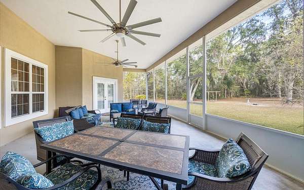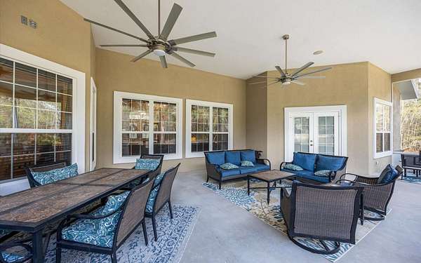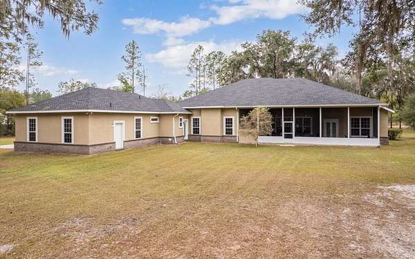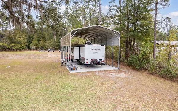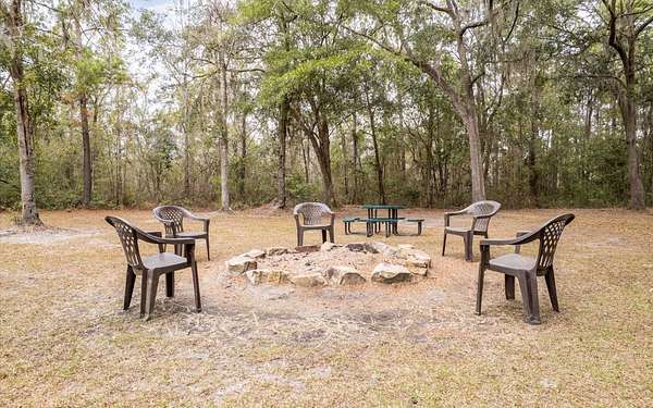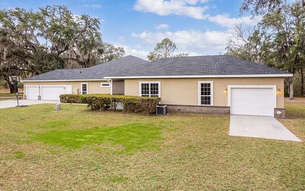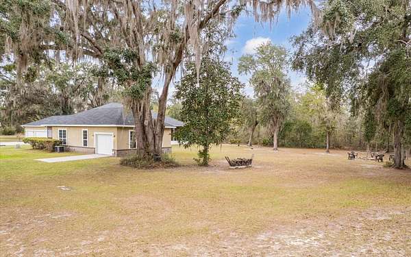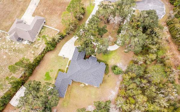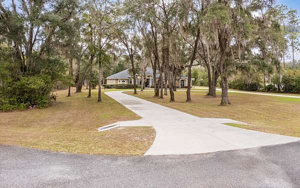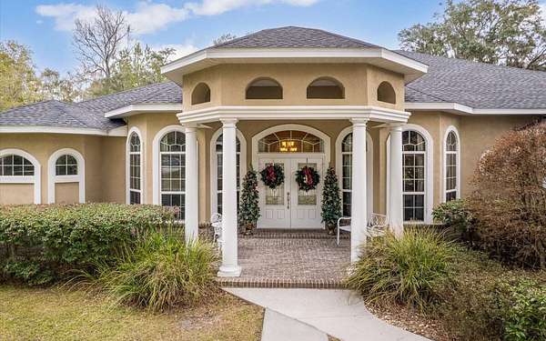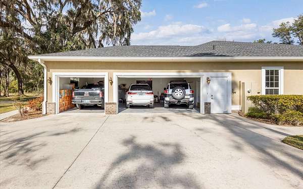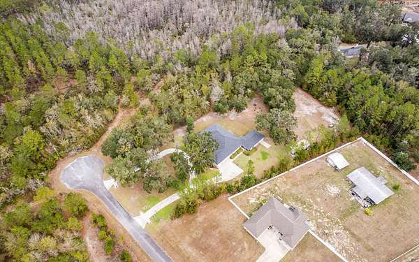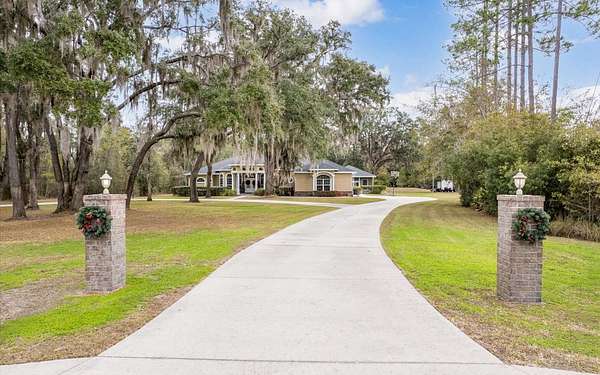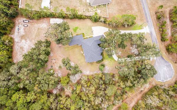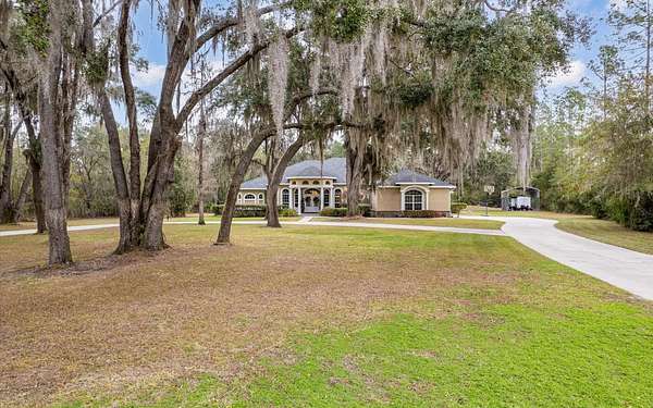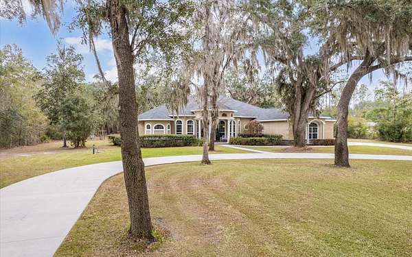 Tucked at the end of a quiet private cul-de-sac, this spacious estate offers room to live, entertain, and unwind on 4 picturesque acres--about half of which are already cleared. Deer frequently wander through the property, enhancing the peaceful, natural atmosphere. The main home includes 3 bedrooms plus an office and 3 baths, highlighted by 12-foot ceilings, a gas fireplace, and a surround-sound system with built-in acoustic panels. The primary suite stands out with a rare his-and-her configuration featuring two sinks, two toilets, two closets, and dual entrances to an oversized shower. For those who need ample storage or workspace, the property delivers: a 3-car garage plus an additional garage that can serve the apartment or function as a workshop, complete with its own half bath. Outside, a 40' x 16' RV pole barn with 50-amp service makes travel preparation effortless. Hardwood and tile flooring run throughout, and both kitchens and all baths feature all-wood custom cabinetry and solid-surface countertops. A standout feature is one of the largest screened porches in the county--an ideal place to relax beneath the shade of beautiful Live Oaks. This property offers a rare blend of privacy, practicality, and comfort, perfect for anyone seeking space, flexibility, and a serene country setting.