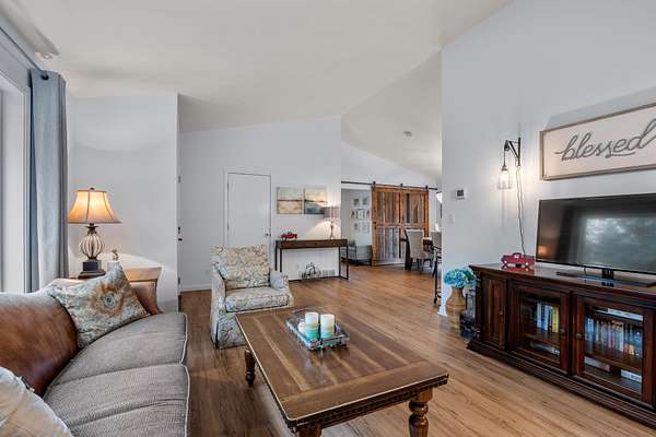 Life in the country....But close in Easy Living - with animals! Horses, Goats, Chickens or convert barn to shop. Level 5.53 acre parcel off road-county road. Stick built very snazzy-chill interior - totally updated- light & bright w/cathedral ceilings. 3 bedrooms, 2 bath - 1 level - LVP flooring - NO carpets!! Barn door separates living from 2nd & 3rd bedrooms. Primary separate from other bedrooms. Furniture negotiable. Kitchen-Large Butcher Block work spot. Colors are off white and fresh. Machine shed for cars, trailers, etc. 2 stall barn w/runs-Equine fence and round pen. New Roof 2024, Updated Septic 2024, New Deck 2025. 7 minutes to Cheney - 18 min Spokane Airport. Easy-Fix to enhance/curb appeal - Printable Flyer