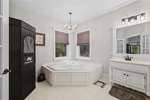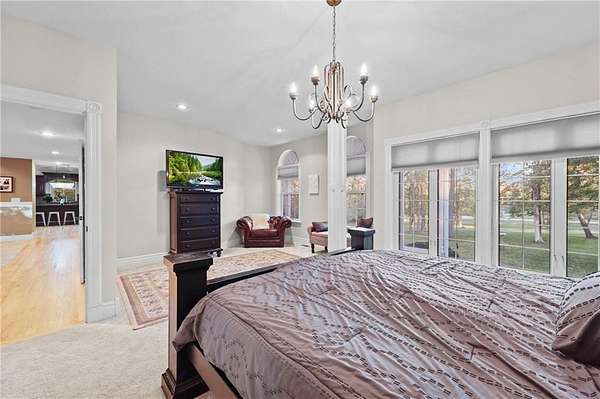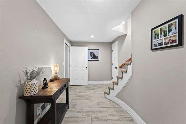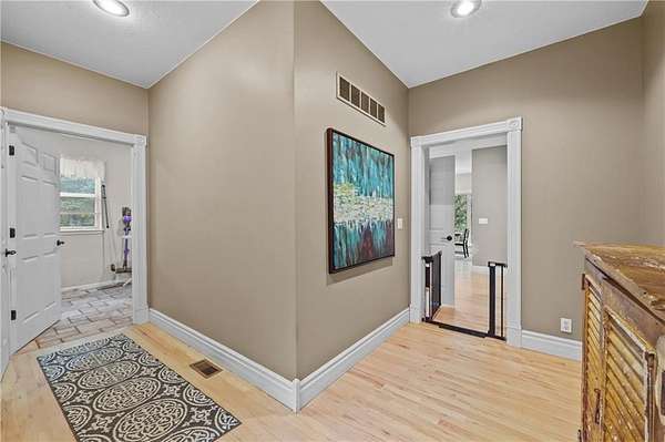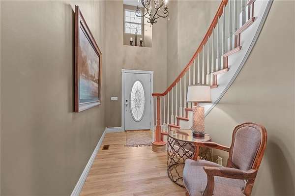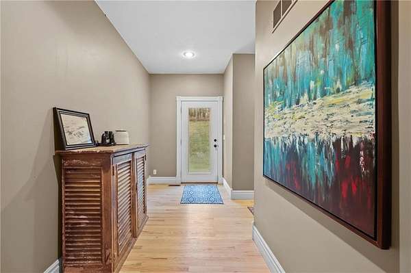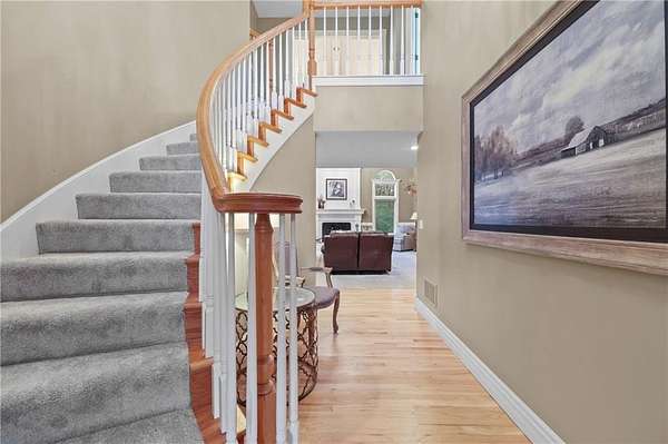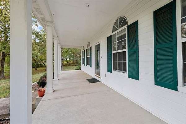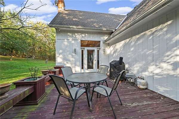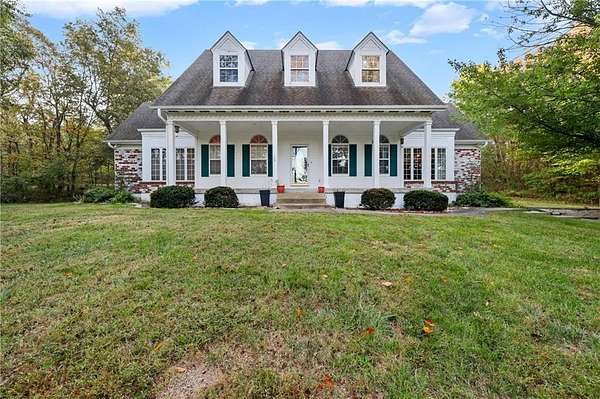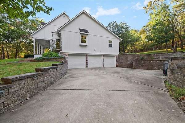 Experience refined country living in this exquisite 4-bedroom, 3.5-bath estate on 7.5 wooded acres with Johnson County taxes and paved access. Boasting over 4,000 sq ft, this home welcomes you with a grand spiral staircase, stunning chandelier, and abundant natural light. The chef's kitchen features granite countertops and cabinet space galore, opening to elegant living areas accented by two fireplaces and gorgeous light fixtures throughout. The main-floor primary suite offers privacy and comfort, with additional bedrooms upstairs and in the finished lower level. Enjoy breathtaking views from every angle, a charming front porch, an oversized three-car-garage, and professionally designed retaining walls. A perfect blend of sophistication and serenity nestles among trees.
