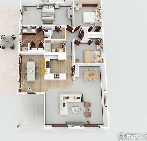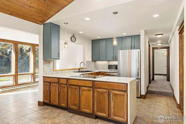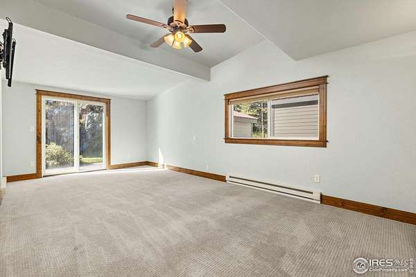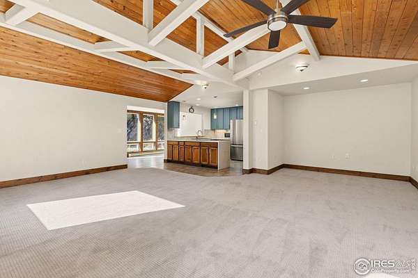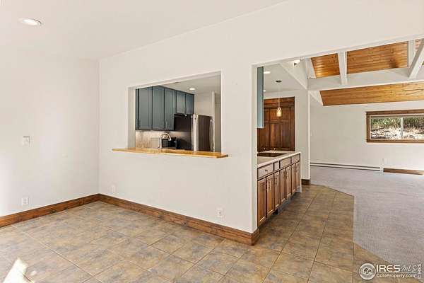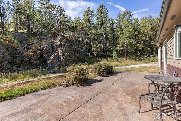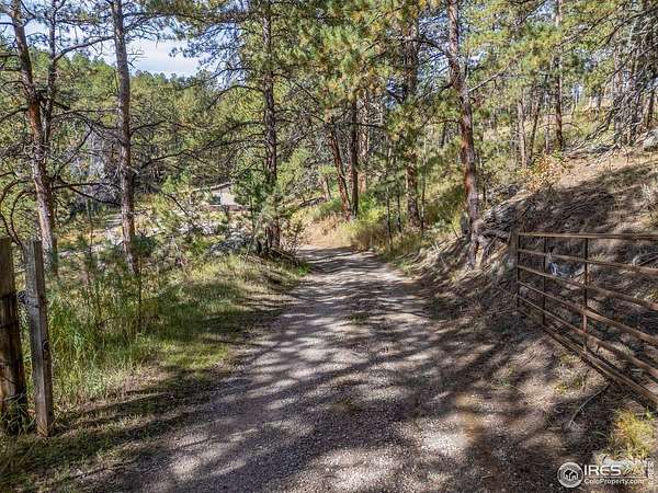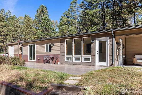 Nestled among nearly 6 wooded acres just minutes from Pinewood Reservoir, this well-maintained mountain home combines comfort, privacy, and natural beauty. The property features a seasonal stream that winds through rock outcroppings, creating a peaceful backdrop for enjoying the outdoors. Relax on the front porch or entertain on the stamped concrete patio surrounded by trees and wildlife. Inside, the inviting open floorplan includes a bright sunroom, vaulted ceilings with exposed beams, and a tastefully updated kitchen with stainless steel appliances, quartz countertops, and a tile backsplash. The spacious primary suite offers a walk-in closet and private 3/4 bathroom with heated tile floors, dual sinks, and convenient laundry. Two additional bedrooms and a full bathroom complete the home, providing plenty of space for guests. Practical upgrades enhance everyday living, including new carpet throughout, abundant storage, and thoughtful finishes that maintain the home's warm mountain character. Outside, you'll find a detached two-car garage with a 220-volt outlet for EV charging, plus two versatile sheds - one housing the well equipment and the other heated with additional storage. With extra parking for an RV or camper, there's room for all your Colorado adventures. Located just west of Loveland with quick access to Pinewood Reservoir, Carter Lake, and countless outdoor opportunities, this property offers the perfect balance of seclusion and convenience. Experience mountain living at its best - a retreat you'll love coming home to.
