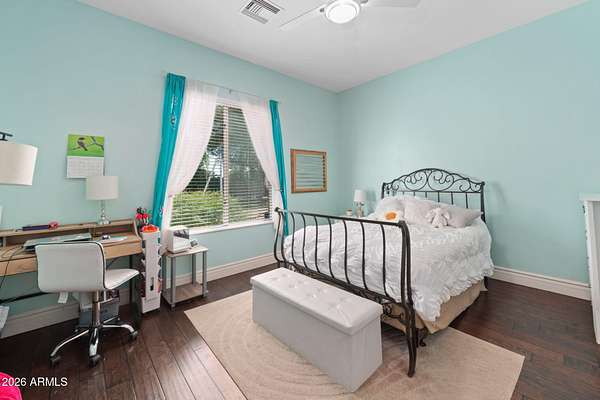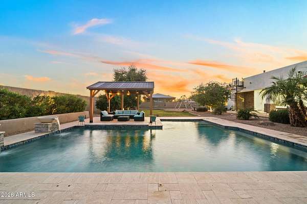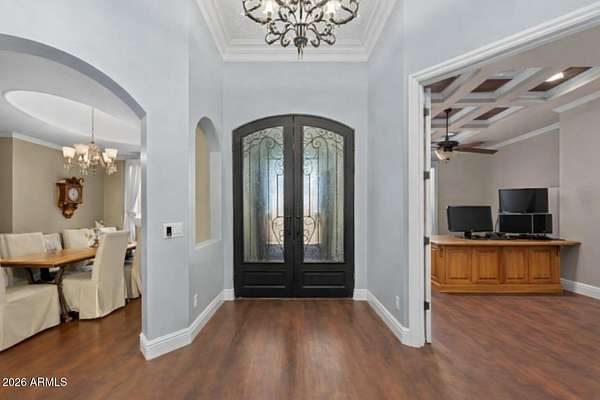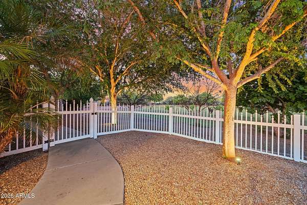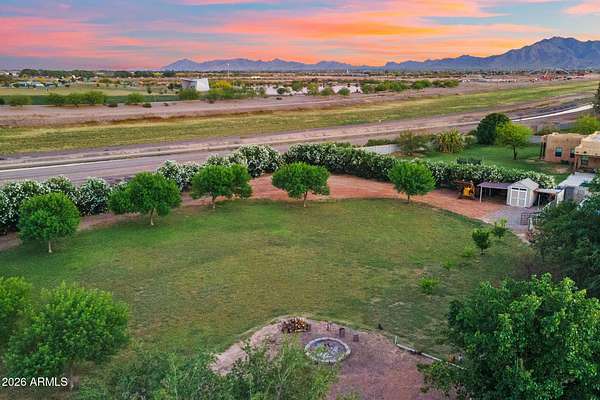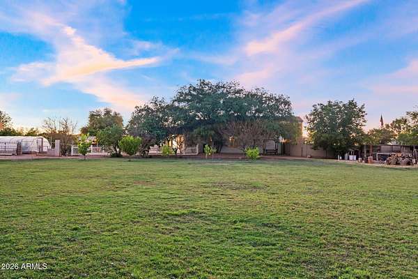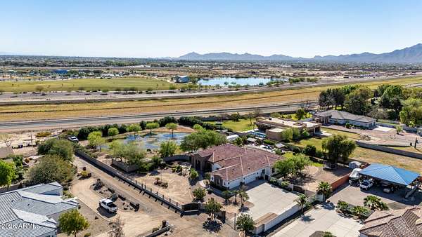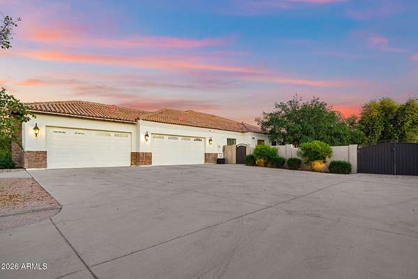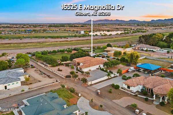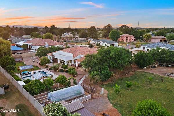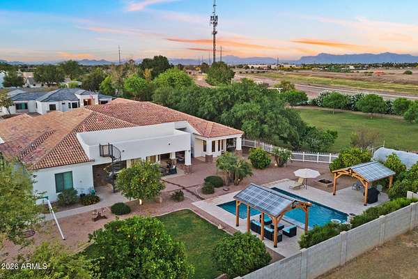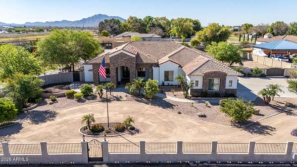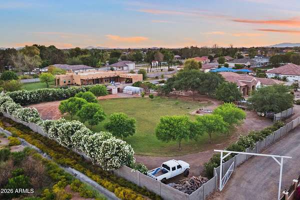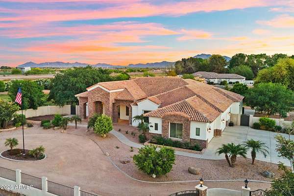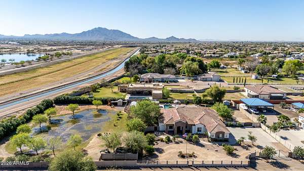Rare opportunity to own a private gated acreage estate on a desirable County Island setting just minutes from Downtown Gilbert. Set on almost 2 irrigated acres, this single-level residence offers over 4,100 square feet with five bedrooms, a dedicated office, and six bathrooms. The grounds are a defining feature, showcasing gardens, raised beds, and a plentiful variety of mature fruit trees including citrus, fig, pear, plum, and stone fruit. Outdoor living centers around a resort-style pool with swim-up bar, shaded gazebos, and a convenient exterior-access pool bath. Additional highlights include canal and trail access, observation deck views, four-car garage, and generous parking areas. The property offers exceptional privacy, space, and the freedom that comes with a County Island Estate Overview: Rare opportunity to own a private gated estate on nearly two irrigated acres in a highly desirable County Island setting just minutes from the energy, dining, and entertainment of Downtown Gilbert. Properties offering this combination of irrigated land, privacy, mature orchards, and convenient access to the town's vibrant amenities are increasingly difficult to find. The residence is thoughtfully positioned near the center of the parcel, allowing expansive grounds to unfold in every direction and creating the sense of a private estate compound surrounded by gardens, trees, and open land. Arrival & Grounds: Entry begins through a secure gated compound featuring three vehicle gates, including a primary automated entrance that opens to a sweeping circular driveway and expansive motor court designed for ease of access and impressive arrival. Mature landscaping and shade trees frame the approach while the surrounding acreage provides separation from neighboring properties. Private road access enhances privacy and convenience. A private gate leads directly to the adjacent canal and trail system, offering opportunities for walking, cycling, and outdoor recreation. An elevated observation deck provides views of the surrounding landscape and nearby regional park lake while capturing sunsets and community events in the distance. The expansive irrigated acreage offers exceptional flexibility for outdoor living and land use. Livestock and horses are permitted on the property, creating opportunities for equestrian use or hobby farming. The grounds provide ample space for horse stalls, barn structures, or animal enclosures, while still maintaining generous room for gardens, orchard areas, and outdoor entertaining spaces. Residence: The estate features a spacious single-level custom residence with over 4,100 square feet designed for comfortable living and entertaining. The floor plan includes five bedrooms plus a dedicated office with private exterior entrance, ideal for a home office, studio, or meeting space. The home offers six bathrooms, including a convenient exterior-access pool bath designed for guests enjoying the outdoor amenities. Architectural details throughout include three fireplaces, real wood flooring, crown molding, oversized baseboards, and extensive custom cabinetry and built-in storage. The split floor plan allows the primary suite to remain private while secondary bedrooms provide comfortable accommodations for family and guests. Primary Suite: The primary retreat offers generous space and a spa-inspired bathroom highlighted by an extraordinary walk-in shower and large Jacuzzi soaking tub, creating a relaxing environment designed for comfort and rejuvenation. Secondary Bedrooms: Each additional bedroom features its own private bathroom and walk-in closet, creating privacy and flexibility for family members, guests, or extended household living. Kitchen & Gathering Areas: The kitchen and gathering spaces are designed for connection and entertaining, featuring granite countertops, generous preparation areas, and open living spaces that flow naturally into the surrounding entertaining areas. Outdoor Living & Entertaining: Outdoor