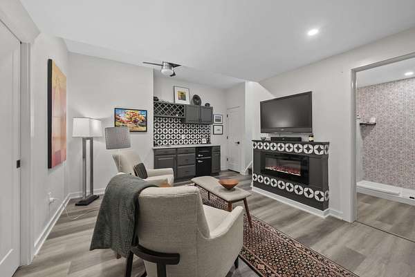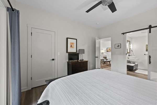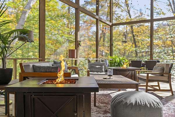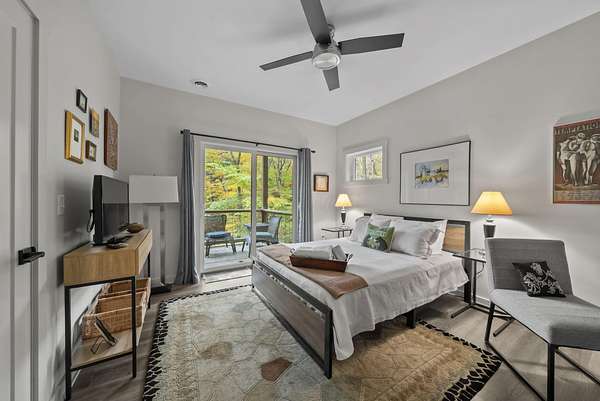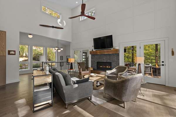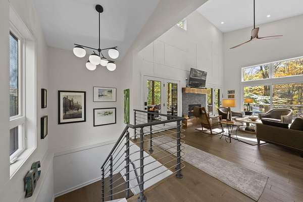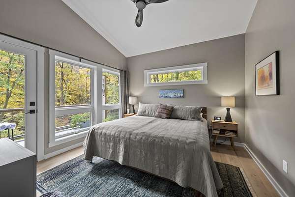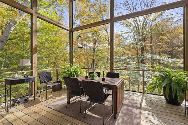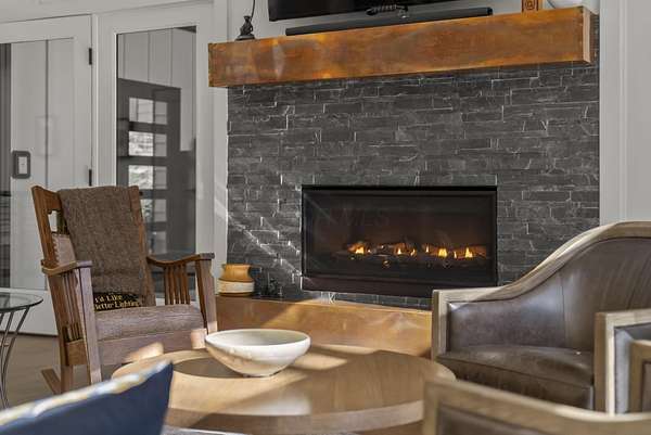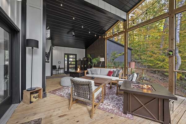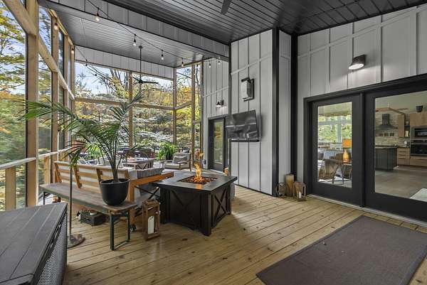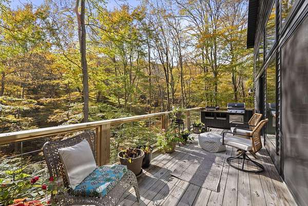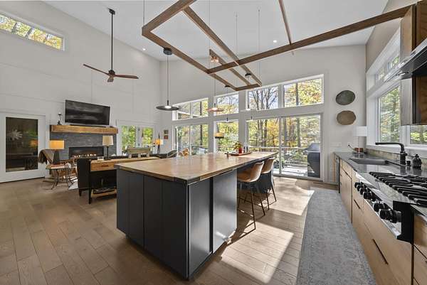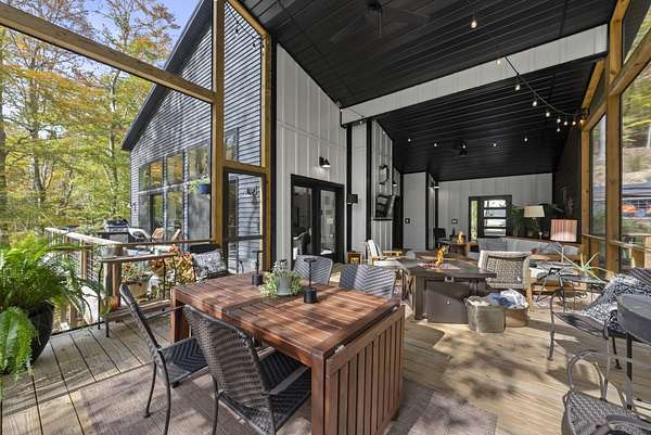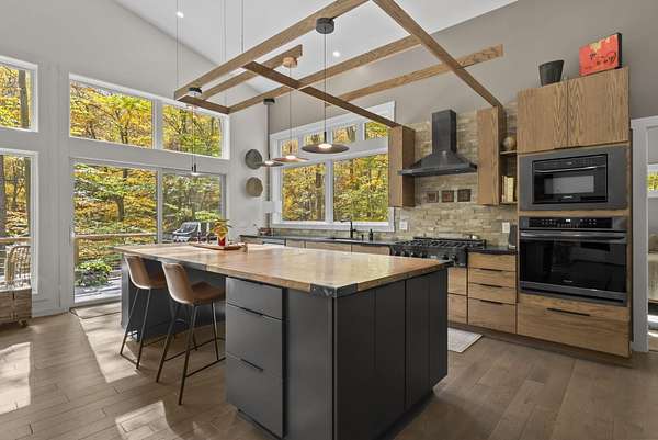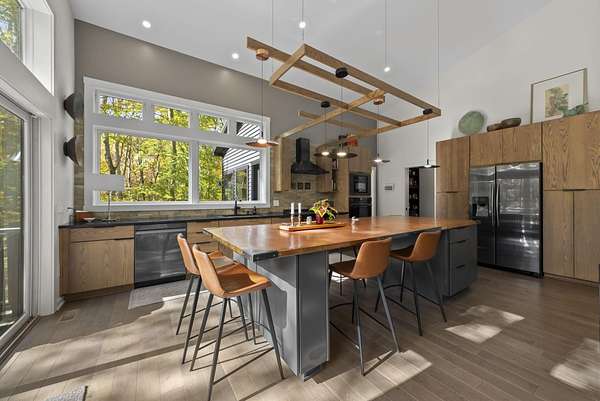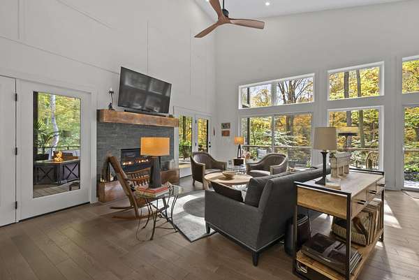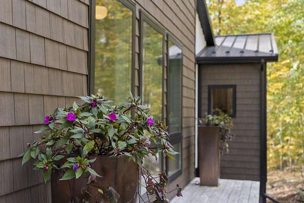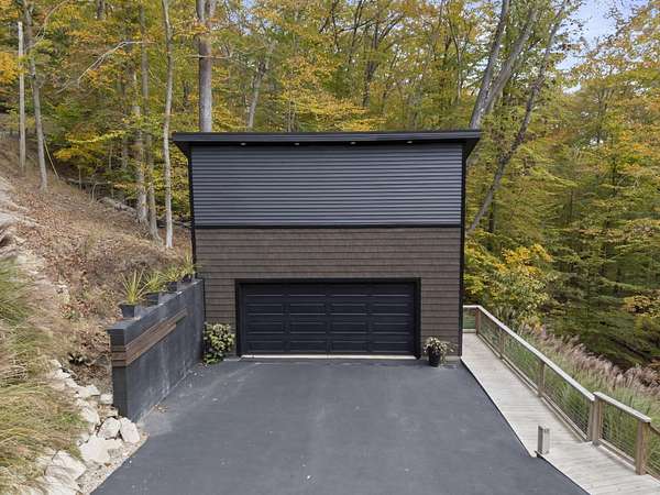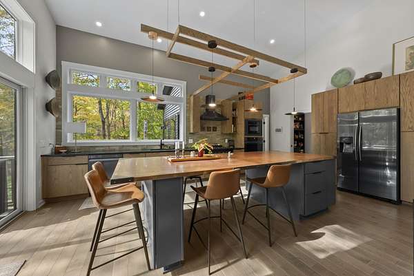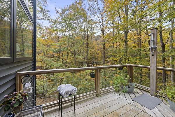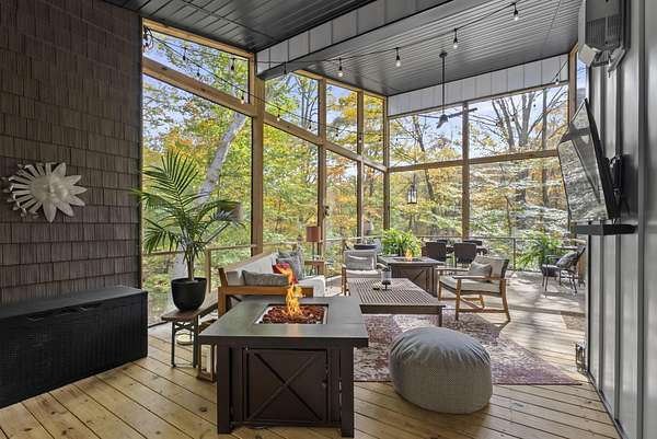 Tucked into the natural quiet of Hide-A-Way-Hills, this thoughtfully designed three-bedroom retreat blends modern craftsmanship with a sense of calm you feel the moment you arrive. Just over 2,000 square feet, the home was built with intention allowing energy efficiency and style to work seamlessly together. The modern exterior, anchored by a standing-seam metal roof, sets a clean architectural tone. Inside, expansive windows allow natural light to move effortlessly through the main living spaces, grounding the home in warmth and simplicity. The kitchen is both functional and artful, featuring flat-front cabinetry, a six-burner gas cooktop, convection microwave, and custom, artist-created tilework. An oversized sculptural copper island serves as the heart of the space-equal parts statement piece and gathering place. Living areas are layered with texture and comfort: hardwood floors on the main level, a propane fireplace upstairs for cozy evenings, and an electric fireplace on the lower level for effortless ambiance. Heated floors in the full bathrooms add a quiet luxury you'll appreciate year-round. A generous screened porch extends the living space outdoors, offering a peaceful place to unwind while staying connected to the surrounding landscape. Outdoor showers on both levels further immerse you in a true indoor-outdoor living experience-without sacrificing comfort. The lofted, oversized two-car garage provides flexibility for storage, hobbies, or gear, all without compromising design. Whether searching for a second home or a year-round escape, Hide-A-Way Hills offers an unmatched blend of privacy, amenities, and lifestyle. See attached list for a full description of this enchanting community.
