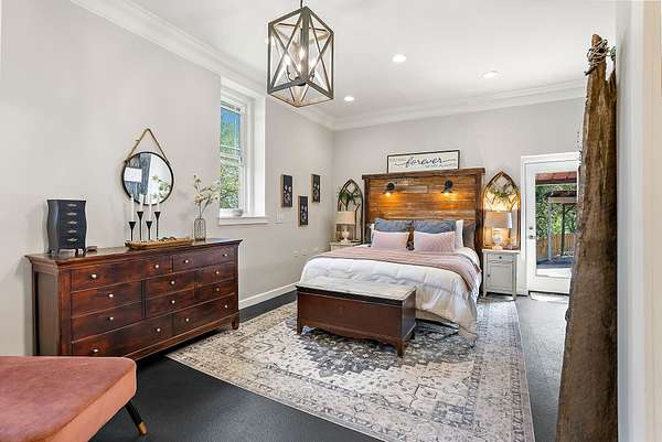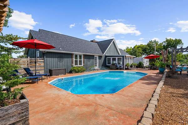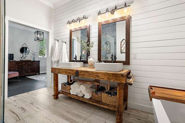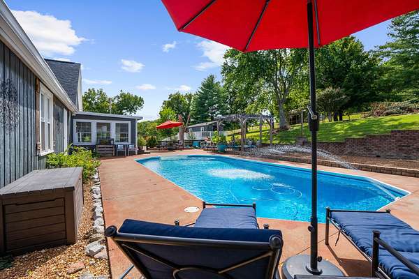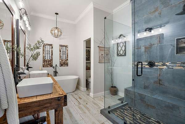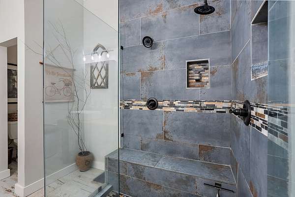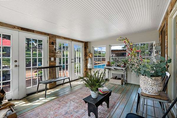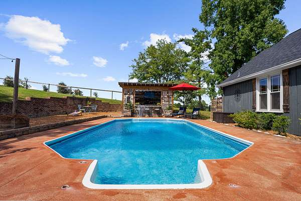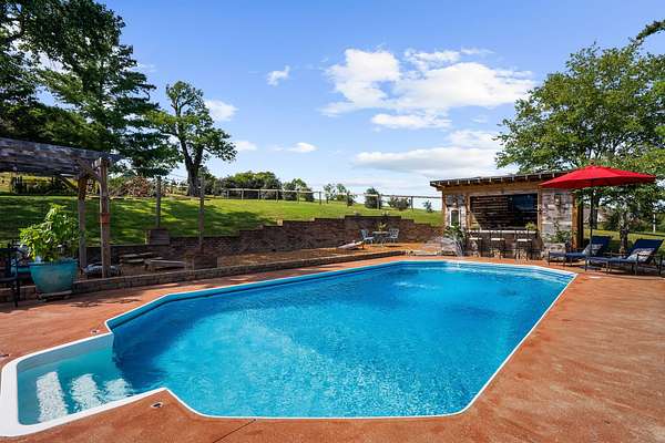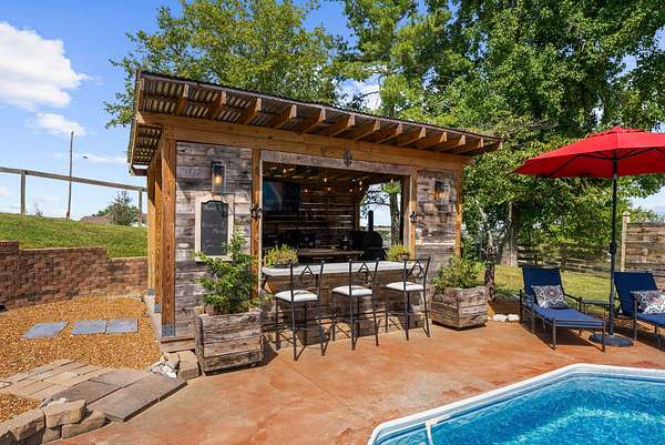 The primary suite is a private retreat with its own climate control, outdoor access, soaking tub, oversized tiled shower, and double vanities. Outside, the home shines with an in-ground saltwater pool, rustic outdoor kitchen, and multiple entertaining areas surrounded by mature trees and scenic views.
