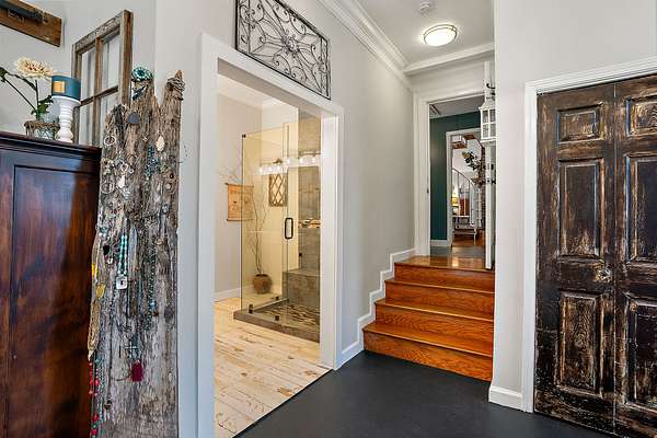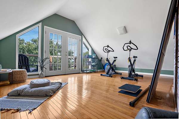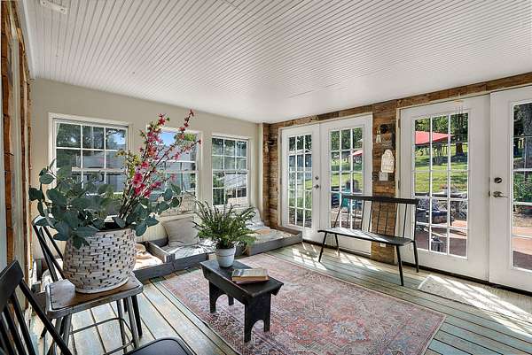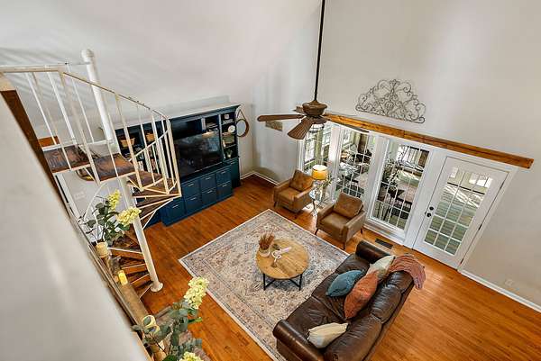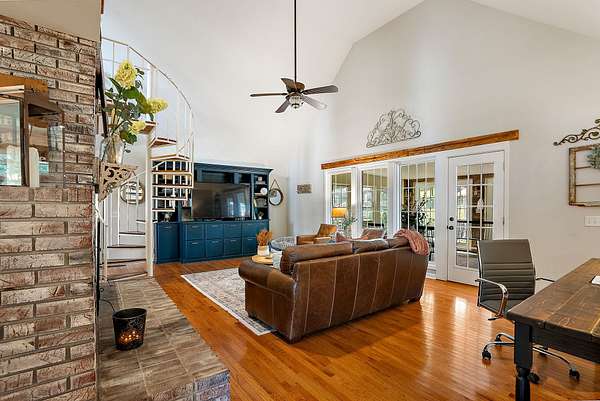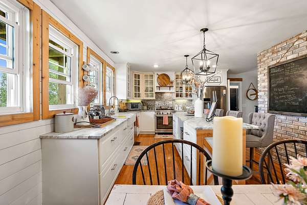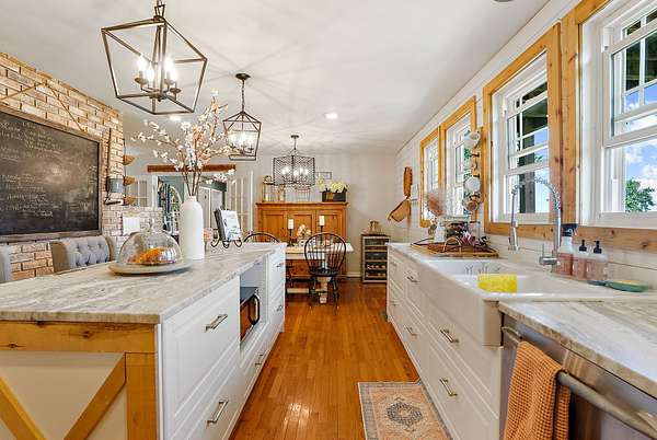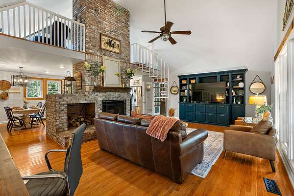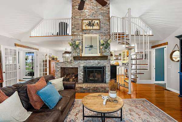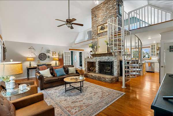 The custom kitchen is the heart of the home, offering leathered granite countertops, an oversized apron sink, and premium cabinetry. Just off the kitchen, the spacious living area centers around a large wood-burning fireplace, and a sunroom adds extra flex space filled with natural light. A spiral staircase leads to a loft ideal for a home office, gym, or media room.