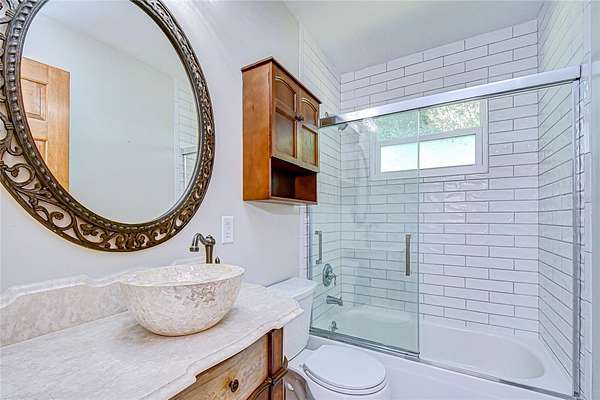 Completely remodeled and perfectly situated on 2.87 acres in the rolling hills of Dade City's Blanton area, this 3 bedroom, 2 bath + bonus room pool home offers an expansive open floor plan living space, stunning upgrades, and a beautiful outdoor setting perfect for comfortable rural living. Arrive at this serene property down a long, welcoming driveway lined with mature trees, leading to a spacious parking pad and a detached 37x25 garage. Step inside through the charming covered front porch and be immediately captivated by the expansive open-concept floor plan, highlighted by gorgeous porcelain tile flooring throughout, vaulted ceilings, wood beam accents, and a stunning stone-faced wood-burning fireplace with a live-edge wooden mantle. Natural light floods the living space through triple sliding doors, creating seamless indoor-outdoor living with direct access to the pool deck. The completely remodeled kitchen is a chef's dream, featuring brand-new appliances, stone countertops, a central island with storage, stylish updated lighting, and an eat-in dinette. Entertain guests effortlessly in the formal dining room, conveniently located just off the kitchen. Privately split from the secondary bedrooms, the primary suite offers a peaceful retreat with private French door access to the pool deck, a massive walk-in closet, and a luxuriously updated ensuite bathroom featuring a soaking tub, dual sinks, updated lighting, and a custom walk-in shower with a sleek glass enclosure. Two additional secondary bedrooms are generously sized and share the home's beautifully updated full bath. Additionally, a versatile bonus room offers endless possibilities -- use it as an additional bedroom, a home office, playroom, media room, or more! Step outside and fall in love with your personal slice of Florida paradise. The lanai and pool deck overlook a lush backyard, fully enclosed with added privacy fencing. Beyond the pool, two spacious outdoor buildings have been added to maximize your storage and functionality. The largest building is 50x30, offering ample space for equipment, hobbies, or storage. Another 30x14 building features running water and its own water heater, adding endless possibilities for a workshop, guest space, or more! The fenced back pasture is ideal for livestock or outdoor fun, complete with an agricultural stall, feeding pen, and even a treehouse! Located just minutes from the highway and a short drive to downtown Dade City, this property combines modern luxury with the charm of country living. Don't miss your opportunity to own this beautiful, fully updated home with exceptional land and functionality -- call us today for your private tour!