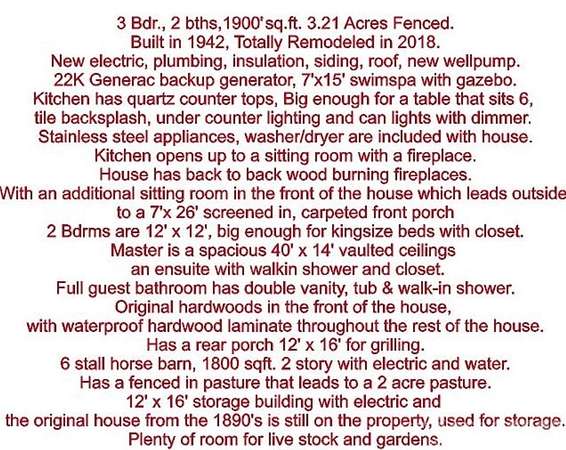 A very rare, beautiful, 3.21 acre farm in the Locust community. The mid-century home was completely renovated and updated in 2018 with new electrical, plumbing, HVAC, whole house generator and much more, please see the attached detailed list of modernizations. As a result it is now a modern, literally like new, 3 bedroom home with 2 full baths. The primary bedroom/bath suite is large with a doorless tile and glass shower. Add to this a screened-in front porch, a deck and plenty of land and farm buildings already in place. For leisure a Swimming/Spa with a raised deck and sundeck is just steps from the main house. Many appliances are included with this home making it literally move in ready with few additions needed. The grounds include a fenced, pastured front, back and side area, a vintage 46ft. X 36ft. tin sided six-stall barn with a hay loft, in great condition. Once an egg producing farm, a block/concrete floor egg house remains very solid. An early 1900's or late 1800's wooden shop also remains from former farm days.