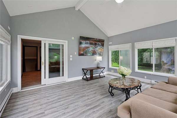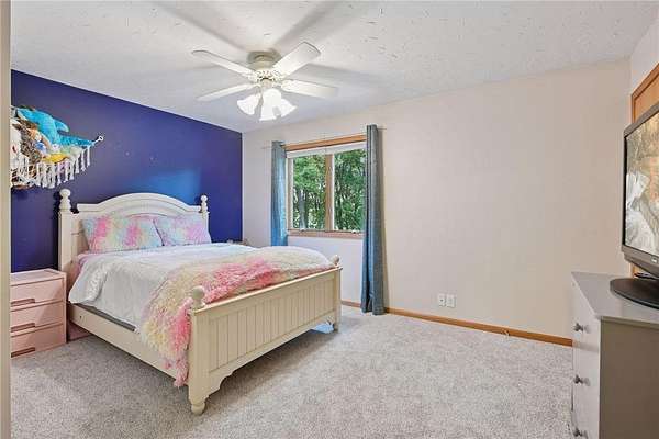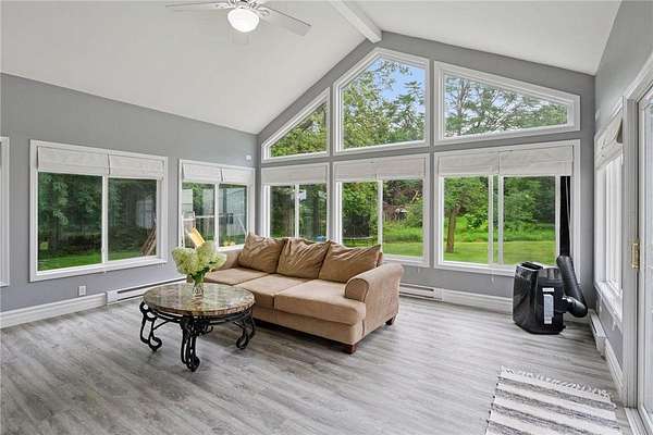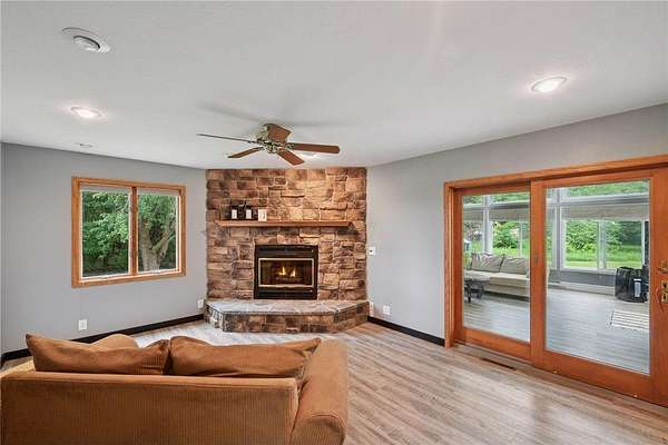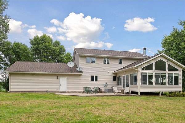 Stunning custom-built two-story on 7.68 mature acres. Large kitchen with new flooring, granite countertops, stainless steel appliances, and oversized dinette with double chandelier.. Main floor family room with raised-hearth, floor-to-ceiling stone fireplace. Formal living room (currently used as guest space), but could be a beautiful home office as well. Convenient 3/4 bath on main level and very large full upper bath. Sun-filled four-season porch with transom windows and vaulted ceilings. This will be your favorite place to be. Imagine the Christmas tree in there. Three bedrooms and laundry room on upper level with hand-troweled ceilings throughout. Full basement with room to expand and plenty of storage. Oversized insulated two-car garage with rough-in for heat. Outbuildings: