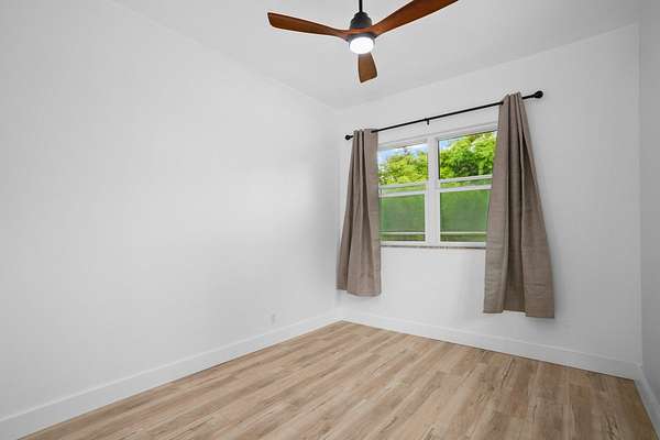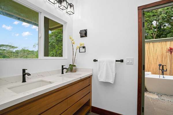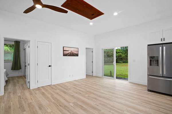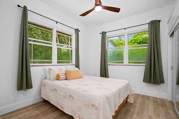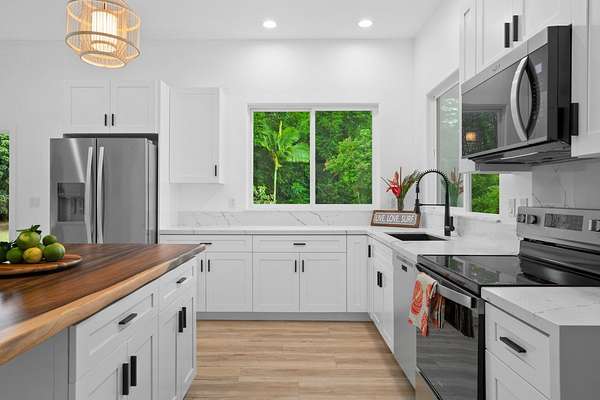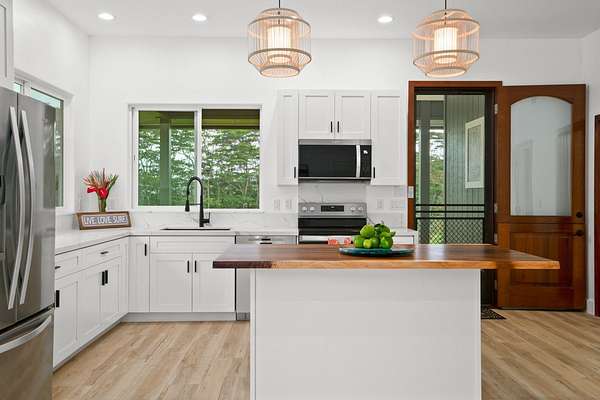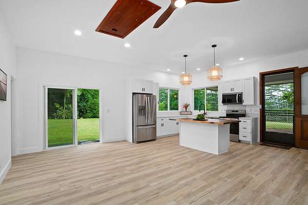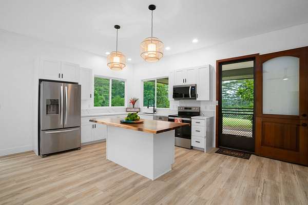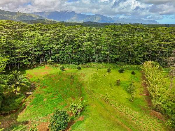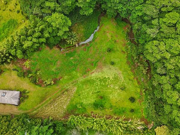 Opportunity awaits to live in a like-new home on acreage on the North Shore of Kauai. This beautifully updated residence features brand-new paint (interior & exterior), new flooring, quartz countertops, new stainless steel appliances, and a new washer & dryer. The home offers one bedroom, plus a bonus room, perfect for a home office, studio, or guest space and 10' high ceilings. Outside, enjoy a beautiful new soaking tub and shower, blending indoor-outdoor island living with a touch of luxury. Set on over 2.5-acres of agriculturally zoned land, this unique property is surrounded by natural beauty. A small stream flows through the landscape with mature citrus, avocado, and lychee trees. The property backs up to expansive open pasture lands, offering privacy in a tranquil setting. With a 5-bedroom septic system and an 80-gallon solar water heater already installed, this property offers immediate comfort and infrastructure for future expansion. Live in the home while designing your dream estate or farmstead. The land offers space, sustainability, and potential in a stunning tropical environment. Located in a quiet North Shore neighborhood just minutes from beaches, botanical gardens, and the charming community of Kilauea, this property is ideal for those seeking a peaceful lifestyle connected to nature, yet close to modern conveniences. A chance to own a rejuvenated home on acreage in one of Kauai's most coveted locations.