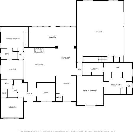 Designed for comfortable one-story living, the functional floor plan includes private bedroom separation, a dedicated office with double doors, and convenient laundry access directly from the wrap around primary closet. The open-concept living area features a spacious family room with fireplace flowing into the kitchen with custom wood cabinetry, double wall ovens, gas cooktop, and generous prep space ideal for gatherings and everyday living.