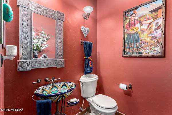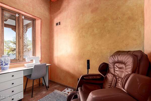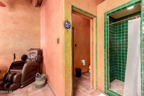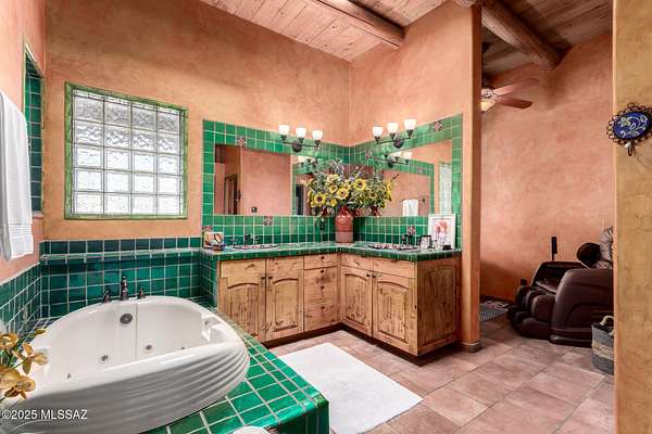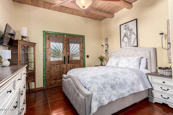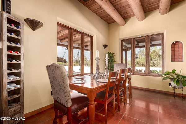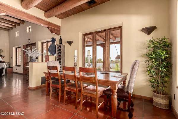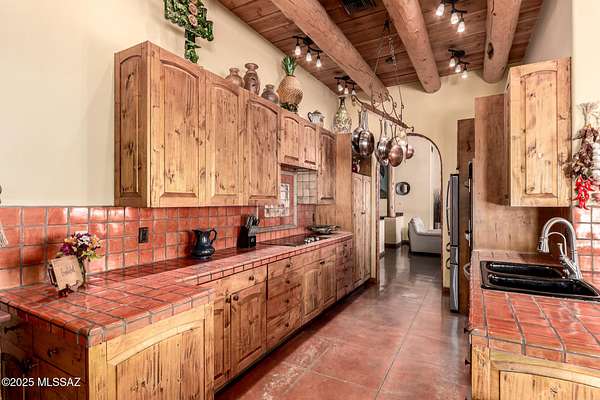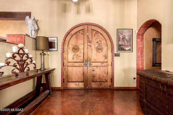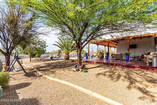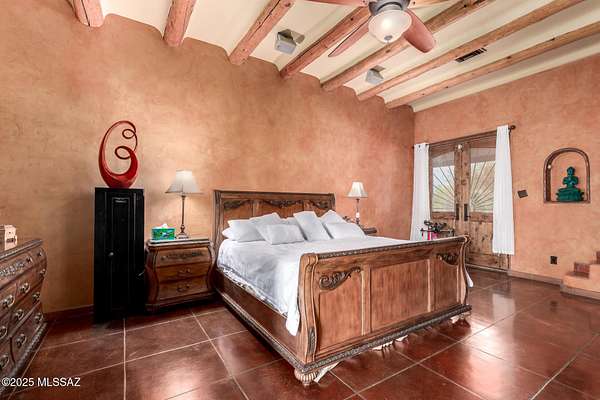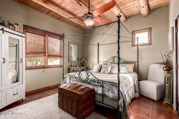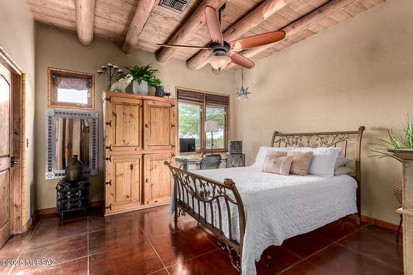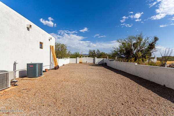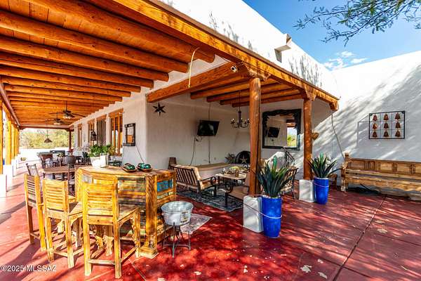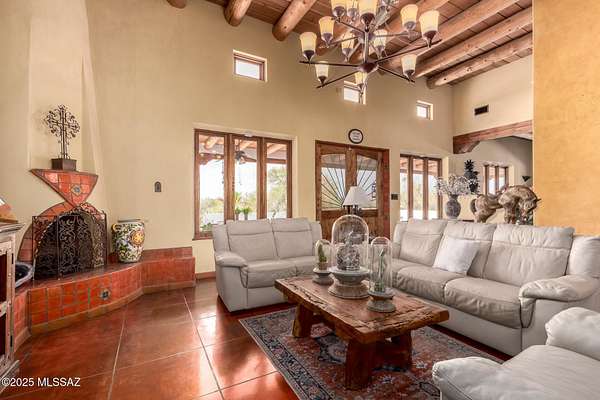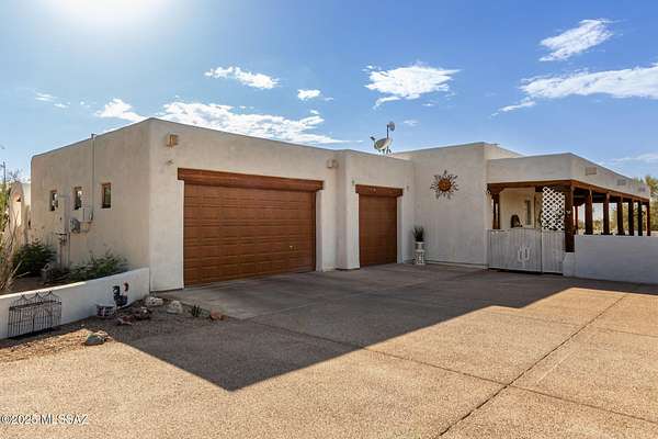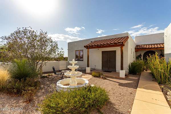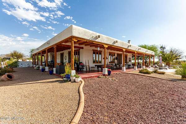 Fabulous custom-built hacienda. This true Sante Fe style home on over 4 acres and 3228 sq.ft. in a gated community. Features hand-made solid wood alder doors and windows, high ceilings with over 100 Vega beams inside and out (imported from Santa Fe) Custom work including lovely Talavera tile sinks, showers, and countertops. Polished scored concrete floors all through out. All bedrooms have own bath and shower. Big master bedroom and walk-in closet with lovely ceiling fans throughout. Over 1900 sq.ft. of vega-beam wrap-around patios, outdoor fireplace, wonderful, heated pool and spa area all within a large walled-in back yard. As you drive up into your full circular driveway you will enter through the front gate to see the lovely front courtyard with fountain. Total privacy and 360 degree views await you at the end of the road.