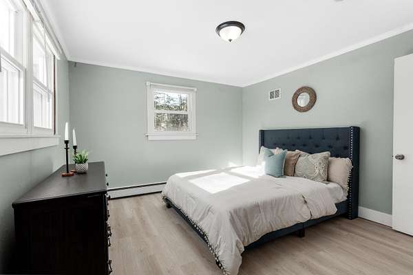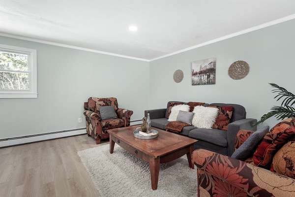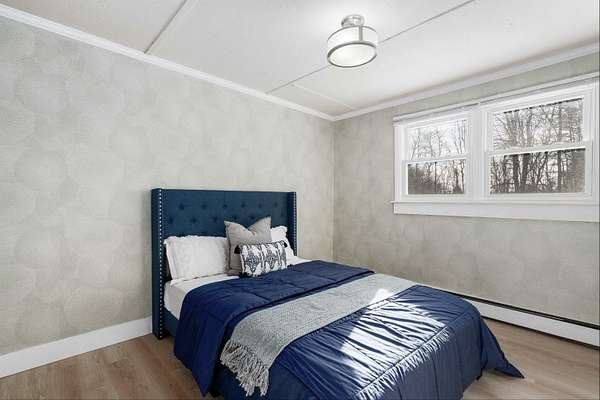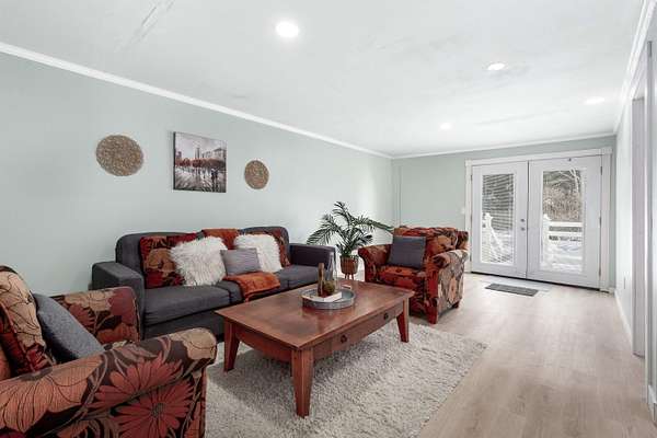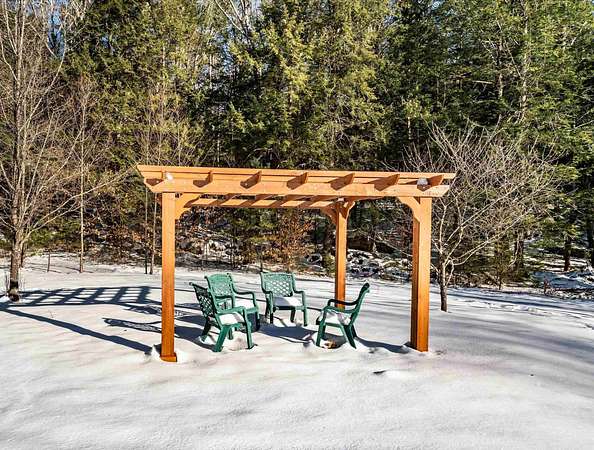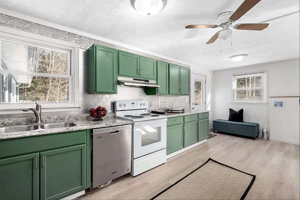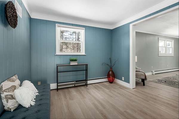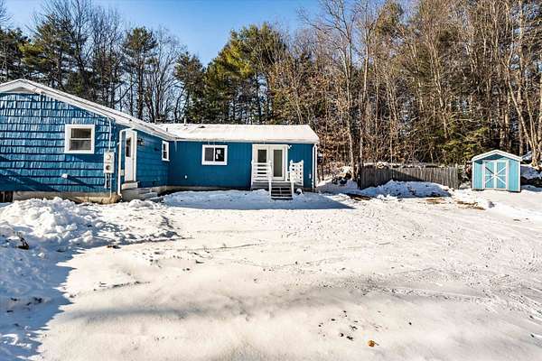 SERENE WOODED RETREAT! NATURE AND PRIVACY ABOUND IN THIS INVITING HOME! Set back from a pretty country road, a gently curving drive leads to a lovely reveal of a striking blue ranch framed by panoramic skies, stone walls and a sense of peaceful seclusion. A welcoming front porch invites you to enter through French doors into a sunlit living room enveloped in soft seaside tones, where pale wide-plank luxury vinyl flooring flows seamlessly through spaces. Relax in the living room with guests, or lose yourself in a book in the adjacent cozy reading nook. Work from home in a painted paneled office that provides ideal room for creativity, making or studies. Head to the happy heart of the home for culinary creations in a kitchen that has been thoughtfully refreshed with new cabinetry and appliances and stylish pressed tin backsplash. Gather in the dining room for memorable meals, then head outside and stroll the land down to the sparkling water of Stanley Brook as you listen to birdsong and catch glimpses of wildlife. Bring refreshments to enjoy under the gazebo as you savor painterly sunsets and peaceful moments amid the beauty of your surroundings. After a day spent hiking nearby Monadnock, paddling on Dublin Pond or exploring art and culinary offerings in Peterborough, unwind in the primary with ensuite bath and rest easy knowing an additional bedroom and flex space offers comfort for guests. SO MUCH POTENTIAL! EMBRACE ONE-LEVEL LIVING SURROUNDED BY WOODS, WATER AND SKY!