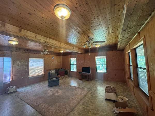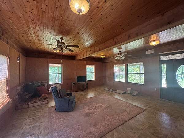 This property offers the perfect blend of seclusion, nature, and potential. Nestled among mostly wooded acreage, McGraw Creek winds through the back of the land, creating a serene and picturesque setting. The home is a solid investment, ready for your finishing touches to bring it to life and make it truly your own. Inside, a cozy woodburning fireplace welcomes you into the living area, while a charming wraparound porch invites you to relax and take in the peaceful surroundings. With no restrictions, this property offers endless possibilities--whether you're looking for a private homestead, weekend getaway, or investment opportunity. Located just minutes from the lake, it's ideal for outdoor lovers. The majority of the land lies in Flood Zone X (minimal risk), with only the creek area designated otherwise.