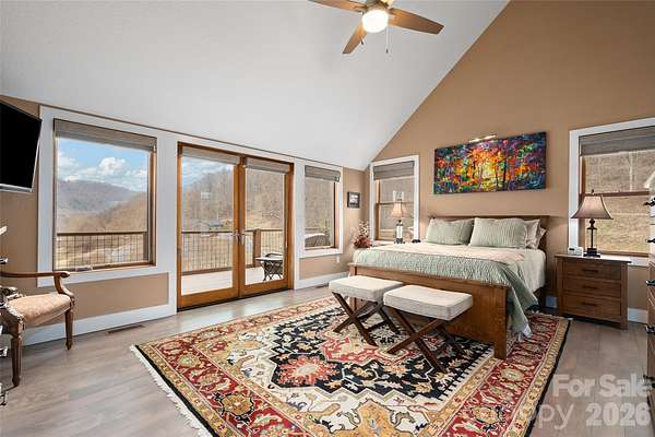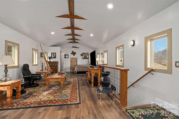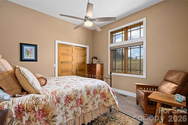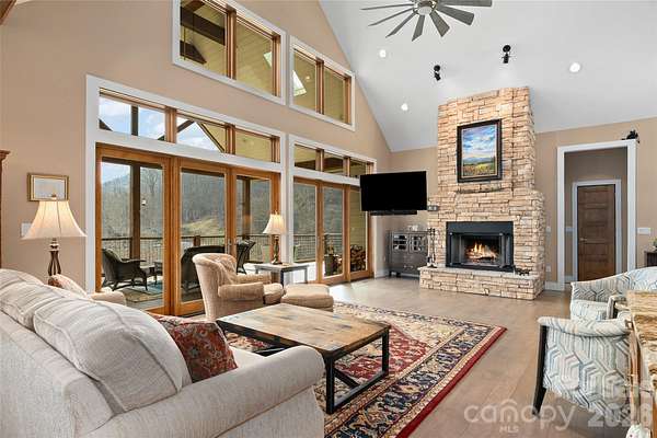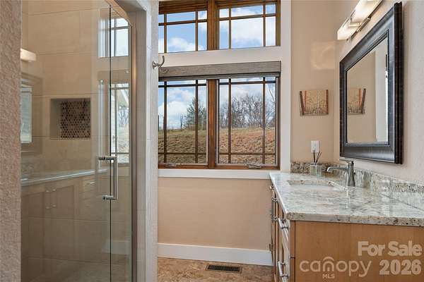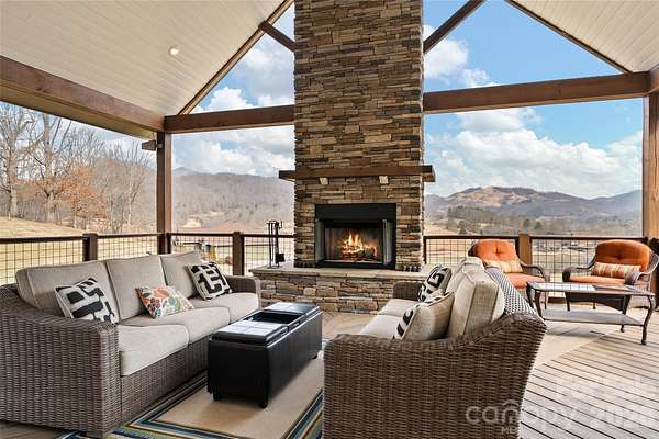 Stunning Craftsman style with contemporary finishes, this extraordinary estate has breathtaking long-range mountain views on 2.64 acres! This exceptional property offers a beautifully designed main residence plus a detached workshop/garage with guest apartment, ideal for multi-generational living, guest space or the ultimate mountain retreat. The main home showcases superior stick-built construction with 2x6 framing (no trusses), solid craftsman doors all with easy-open lever handles, oversized wheelchair-accessible doorways, and high-end finishes throughout. Enjoy abundant natural light from six Velux skylights and Marvin wood casement windows and doors. Two Superior zero-clearance wood-burning fireplaces (Great room and outside deck) add warmth and charm, while LED recessed lighting throughout (all dimmable) enhances the modern feel. The gourmet kitchen is a showstopper, featuring custom solid maple cabinetry with specialty storage, Level 4 granite countertops, under-cabinet lighting, up lighting, and premium stainless steel appliances, including a Bosch dual-fuel range, wine refrigerator and Bosch dishwasher. A wet bar with beverage refrigerator makes entertaining effortless. A spa-inspired primary bathroom include custom heavy-glass enclosures, porcelain tile, dual vanities, a luxurious freestanding soaking tub, and a thermostatically heated bath floor. Outdoor living is unmatched with an expansive 1,800 sq ft covered Trex deck complete with ceiling fans, extensive lighting, hog wire railing, gated entries, and an outdoor wood-burning fireplace, perfect for enjoying the incredible scenery year-round. The oversized garage features insulated 8'x9' doors, abundant storage, a radiant sauna room, and additional exterior gardening storage. Mechanical features include a Bryant Evolution 3-zone HVAC system with app control, propane backup furnace, tankless propane water heater, generator-ready electrical panel, fiber-optic high-speed internet, and a WeBoost cell signal booster. The detached 1,200 square foot shop/garage offers 200-amp service, 240V outlets, LED lighting, a full bath, automatic gated entry, and a spacious guest studio apartment above with kitchenette, mini-split HVAC, stained beams, and heated bathroom floors. Don't miss out on this rare opportunity to own a luxury mountain property with exceptional craftsmanship, incredible views, modern comfort, and unmatched versatility-just minutes from Asheville and all Western North Carolina has to offer.