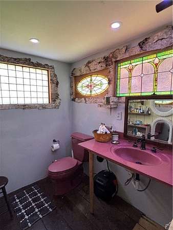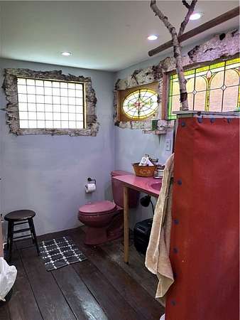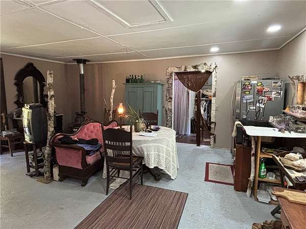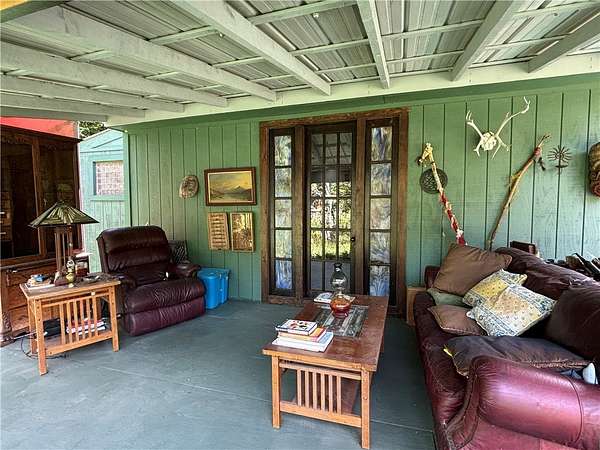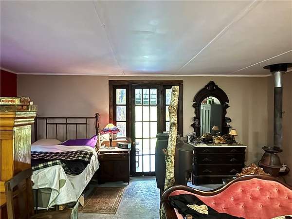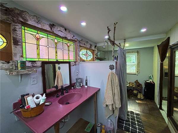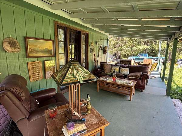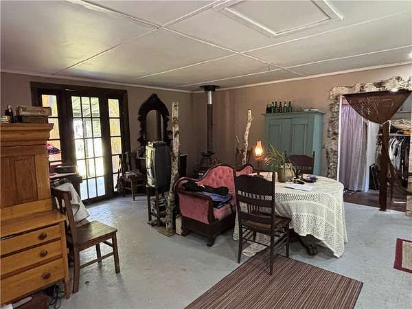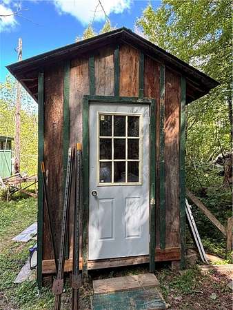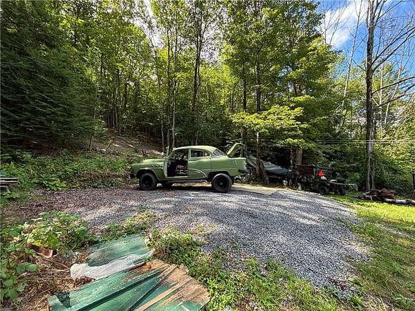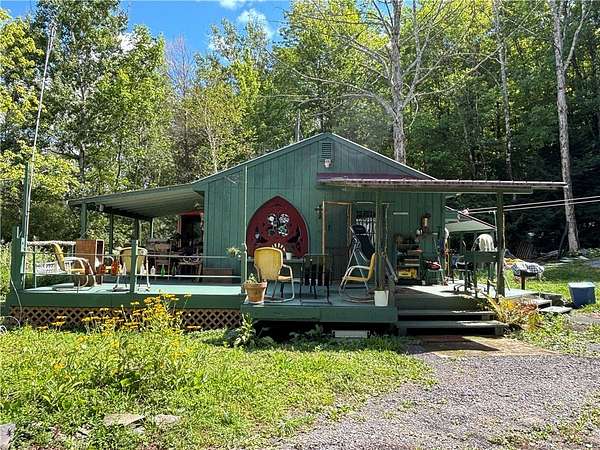 Tucked away on 1.26 acres bordering Bear Swamp State Forest, this rustic cabin offers privacy, recreation, and trails that lead directly into the park. Perfect as a hunting basecamp, weekend getaway, or seasonal retreat, it's designed in a studio-style layout with one open room that combines living, dining, and sleeping space. Inside you'll find the open concept with custom designed stained glass windows, efficiency kitchen with stainless refrigerator and a large sink. The large closet and attic storage leads to a full bath with chestnut wood floor leads and washer/dryer hookups. The cabin is insulated and is heated with a wood stove and easy to drain for times when you are away in the cooler months. Outdoor living is central here - with a 10x20 covered porch, side deck, and a summer kitchen with washer setup located on the porch. A shed and storage container provide additional storage. There is a newer gravel parking area. A rustic retreat offering character, seclusion, and direct access to state land.