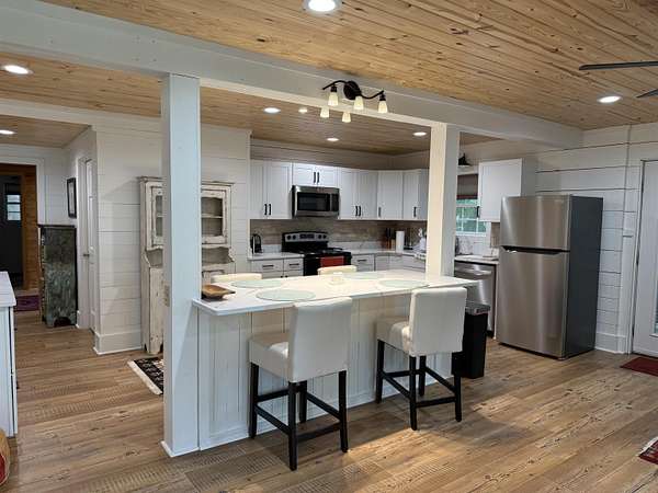 - Breakfast Bar, Ceiling Fan(s) (interior), Ceilings-Beamed, Eat-In Kitchen, Entrance Foyer, Kitchen Island, Natural Woodwork, Open Floorplan, Pantry (interiorfeatures), Primary Shower & Tub, Walk-In Closet(s)