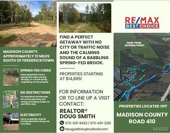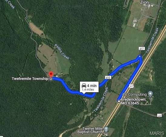 From Fredericktown (Madison County, Mo.) go approximately 10 miles south to Madison Co. Road 417 (CR 417) on right, take 417 a short distance and cross bridge, turn left on CR 410, go about a mile or so to county road 9404. Contact agent for further directions.