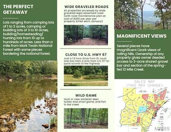 Hunt, camp, build, ride ATVs on your own land, or fish or play in the shared creek section. The opportunities are endless. This property is wooded and rolling. You are within a mile of the 22,176-acre Mark Twain National Forest ... public ground where you can also hunt, ride and explore. All this, and only about 2 miles by road from U.S. 67 for quick and easy access. Use this great 9.392 acres as a base camp for adventure. This and surrounding land is teeming with deer, turkey and small game, and the occasional feral hog or maybe a black bear. Ownership comes with access to a 3-acre shared stretch of the magnificent 12 Mile Creek and gravel bar.
