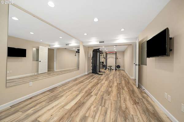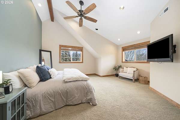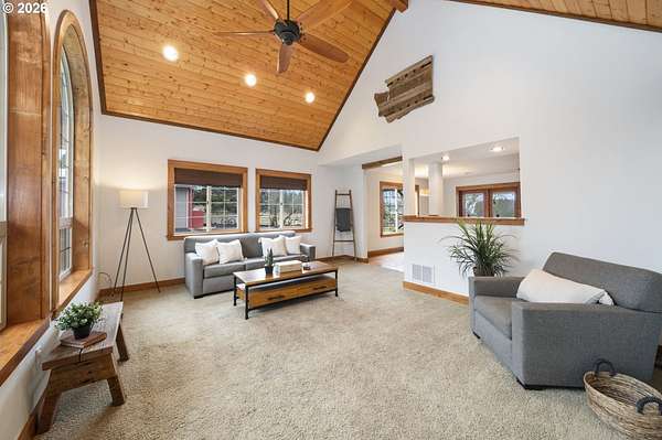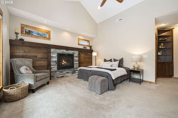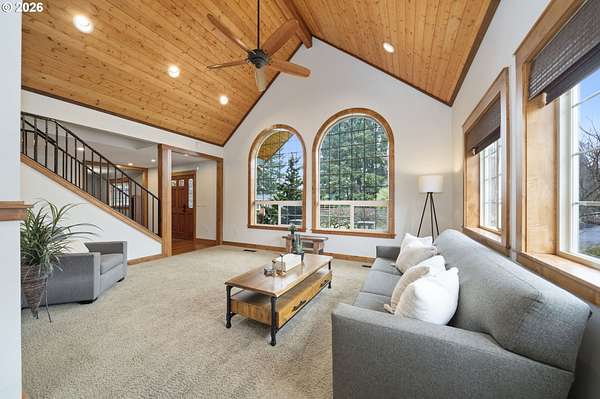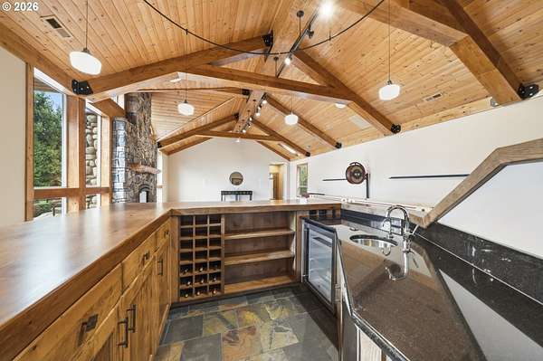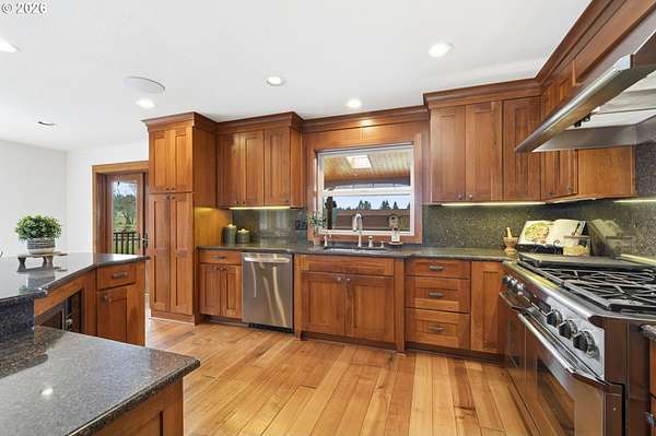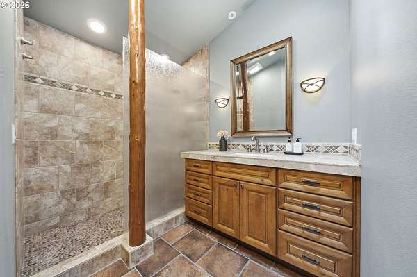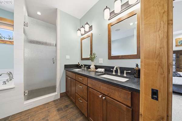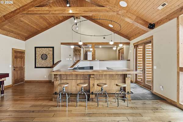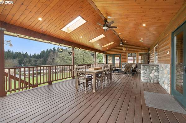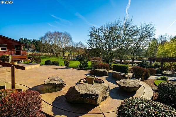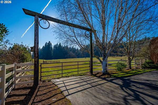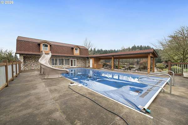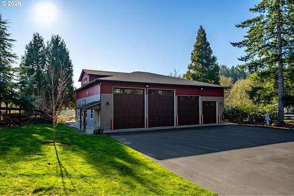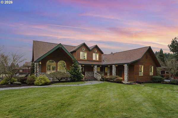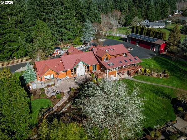 Resort inspired, tree lined Americana estate on 5 picturesque acres with ADU. A rare convergence of architectural presence, resort-caliber amenities, and tranquil pastoral surroundings, just minutes from Old Town Battle Ground! Main residence is both grand and inviting, defined by expansive proportions, gorgeous wide-plank Chilean cherry hardwood floors, and striking constructed beam ceilings creating a sense of volume and elegance. Remodels and further construction done in 2000, 2009, 2017 and 2021. Designed for entertaining, the exquisite great room features a full bar, dedicated recreation space, soaring tongue-and-groove vaulted ceilings with dramatic timber design, and a show stopping floor-to-ceiling stone fireplace. The gourmet kitchen serves as the culinary centerpiece with custom cherry cabinetry, granite countertops, stainless appliances, and a spacious center island ideal for prep and gathering. With two primary suites, the main-level owner's suite is a true private retreat offering a stone fireplace with beautiful timber detailing, a spa-inspired bath, private laundry, and direct access to a covered patio with fire-pit, overlooking the breathtaking grounds. The lower level extends the living experience with a bonus room and private fitness studio with sauna. Outdoors, the estate unfolds as a curated resort setting featuring an in-ground pool with covered lounge area and an adjacent guest house ADU overlooking the back pasture. Amenities: sledding hill, fully lit pickleball/tennis/basketball/ court, sprinkler raised garden beds, pergola, fire pit, and covered deck overlooking the estate. 2 climate-controlled workshop buildings provide exceptional versatility with garage capacity, including four bay 16' ceiling indoor RV and boat parking with a loft and private office with full kitchen and bath. Equipped with geothermal heating and solar, this one-of-a-kind property blends privacy, scale, and modern efficiency, offering an elevated lifestyle rarely found.