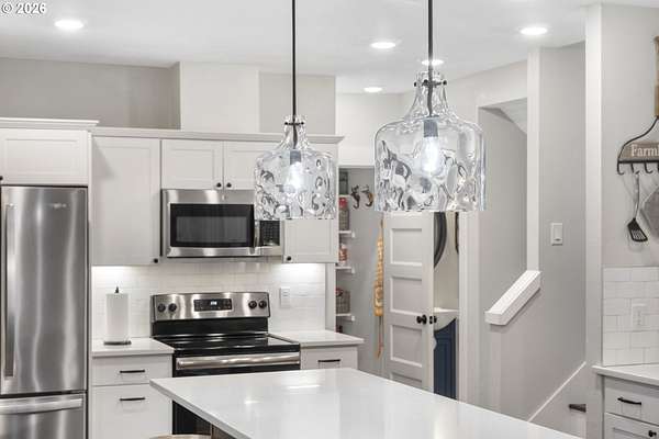 - Free Standing Range, Free Standing Refrigerator, Island, Pantry, Quartz