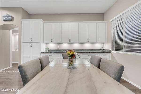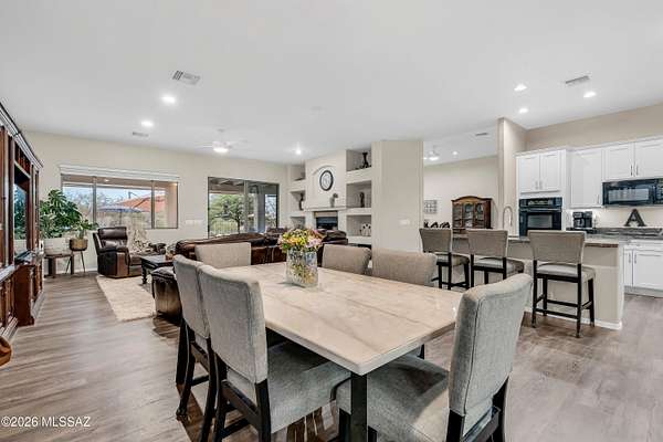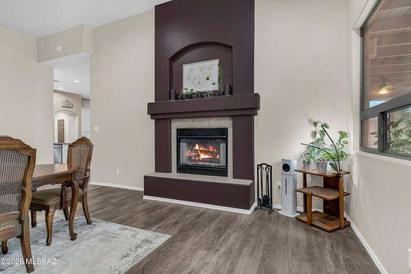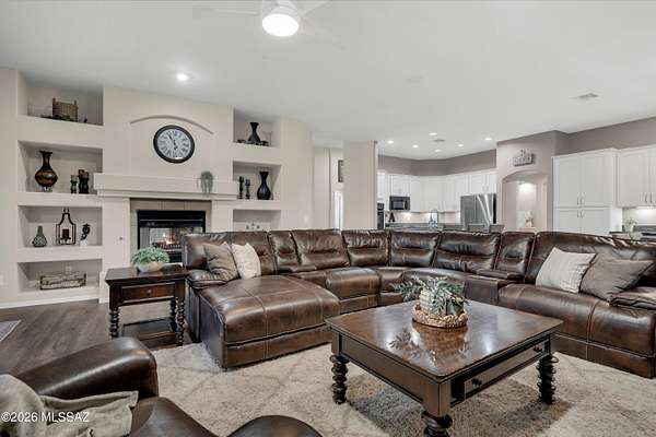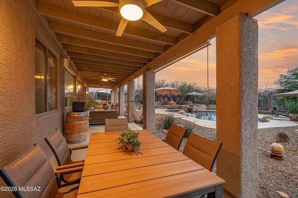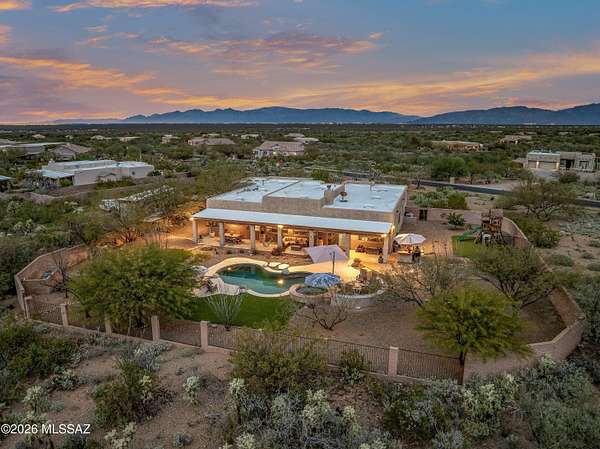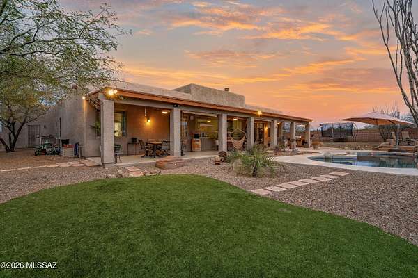 Behind private gates and set on two peaceful acres, this 3,210 square foot single story retreat invites you to slow down and stay awhile. A double-sided wood-burning fireplace connects two welcoming living spaces, while the updated kitchen with extended cabinetry opens effortlessly to the heart of the home. Rich wood look flooring, soft natural light, and thoughtfully designed spaces create warmth, comfort, and a sense of ease throughout. Golden skies and mountain views, stretch beyond the view fence as the pool sparkles and the fire pit glows. From the outdoor kitchen and covered patio to expansive turf and play space, the backyard was made for gathering, relaxing, and making memories under desert sunsets. With a walled-in RV yard with double gate access, and an oversized three car garage, this home blends everyday function with the feeling of a private escape.