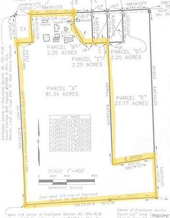 BEG N 88D 06M 23S E 220' FROM NW SEC COR, TH N 88D 06M 23S E 622', TH S 01D 59M 29S E 200', TH S 38D 49M 34S E 250.21', TH N 88D 06M 23S E 325', TH S 01D 59M 29S E 1800', TH N 80D 34M 37S E 610.53', TH S 01D 59M 29S E 565.60', TH S 86D 59M 36S W 1875.18', TH N 02D 59M 28S W 2326.53', TH N 88D 06M 24S E 220', TH N 02D 59M 28S W 396' TO BEG SECTION 30 T6N R13E 81.82A