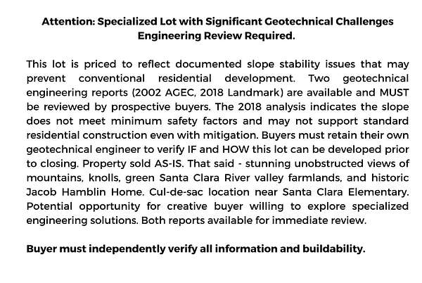 Attention: Specialized Lot with Significant Geotechnical Challenges - Engineering Review Required. This lot is priced to reflect documented slope stability issues that may prevent conventional residential development. Two geotechnical engineering reports (2002 AGEC, 2018 Landmark) are available and MUST be reviewed by prospective buyers. The 2018 analysis indicates the slope does not meet minimum safety factors and may not support standard residential construction even with mitigation. Buyers must retain their own geotechnical engineer to verify IF and HOW this lot can be developed prior to closing. Property sold AS-IS. That said - stunning unobstructed views of mountains, knolls, green Santa Clara River valley farmlands, and historic Jacob Hamblin Home. Cul-de-sac location near Santa Clara Elementary. Potential opportunity for creative buyer willing to explore specialized engineering solutions. Both reports available for immediate review. Buyer must independently verify all information and buildability.