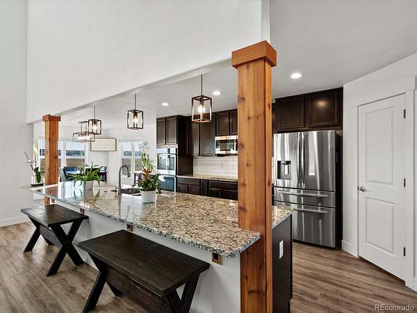 Like-New Custom Home in Pelican Lake Ranch! Built in 2021 and meticulously maintained, this 5-bed, 4.5-bath custom residence offers 2,824 finished sq ft plus a 1,580 sq ft unfinished basement with bath rough-in and three egress windows for future expansion. Inside, the heart of the home is an entertainer’s dream: a chef’s kitchen with double oven, granite countertops, oversized island, large pantry, and sunny eat-in nook seamlessly flows into the soaring great room and separate dining area. The main-floor primary suite is tucked away for privacy, while the upper level features three bedrooms, two full baths, and a flex room/5th bedroom perfect as an office, playroom, or guest suite. Window treatments are included, making this like-new home move-in ready.