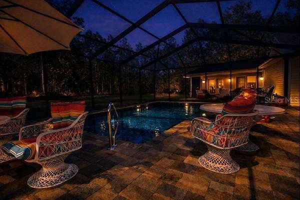 Designed for long-term ownership and flexible living, the split floorplan includes two primary suites--ideal for executive guests, multi-generational households, or private work-from-home accommodations. A 19' formal entry introduces expansive living areas finished with engineered hardwood flooring, 14' tray ceilings, and a handcrafted stone gas fireplace. French doors extend the living space to a fully enclosed, custom-tiled swimming pool, creating a seamless indoor-outdoor entertaining environment.