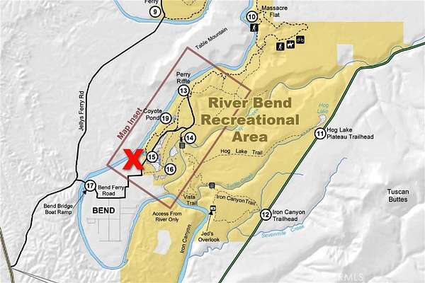 From Red Bluff, drive north on I-5. Exit at Jellys Ferry Rd and drive northeast. Turn right on Bend Ferry Rd. Turn left and right a few times to stay on Bend Ferry Rd. Turn left on River Heights Dr. The parcel is on the left.
