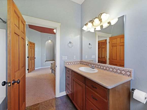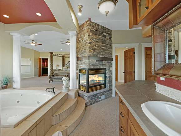 The master bedroom offers luxurious amenities, including a private covered deck, a dual-sided fireplace, a jetted tub, and a walk-in custom steam shower equipped with ten shower heads.