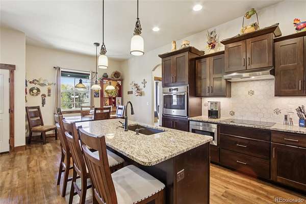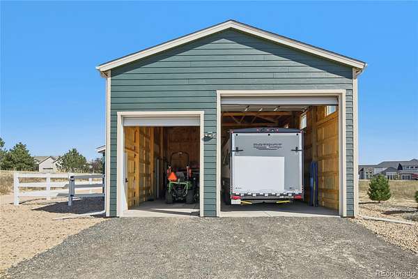 Rare 300,000 Gallons Annually! This property includes a full paid water tap through Central Weld County Water District, providing 300,000 gallons each year for irrigation, gardening, and livestock—an advantage few homes in the area can offer. Welcome to 16499 Essex Rd S in Platteville, a one-of-a-kind ranch-style home with a finished basement set on 2.59 acres. Built in 2018, this 6-bedroom home features an open-concept design perfect for comfort and entertaining. The kitchen showcases stainless steel appliances, granite countertops, an island with breakfast bar, and flows into the dining room with access to a screened-in porch. The main level also includes a luxurious primary suite with two walk-in closets and a private bath, plus three additional bedrooms. Downstairs, enjoy a huge game room with wet bar, insulated media room, bonus room, a full bath, and two more bedrooms, creating space for every need. Outdoors, the property is approved for equestrian use, with paddock, riding space, and allowance for up to three horses. A newly built 40x24 barn easily accommodates a horse trailer, tack, or RVs, while the 30x30 shop with two bays is ideal for woodworking, equipment, or additional storage. A separate storage shed adds even more utility. Additional highlights include a 3-car attached garage, detached garages, fire pit area, and access to community amenities:horse arena, fishing lake, pool, clubhouse, park, playground, tennis/basketball courts, and putting green. With luxury finishes, versatile living, and rare water benefits, this property delivers the ultimate Colorado country lifestyle!
