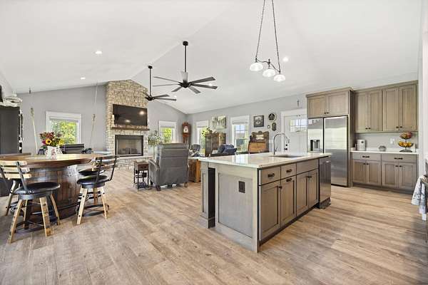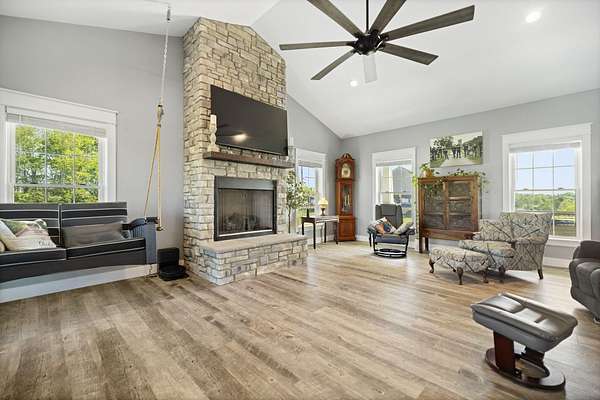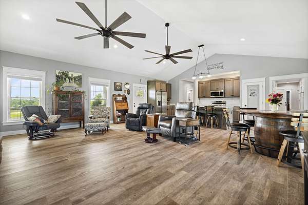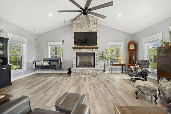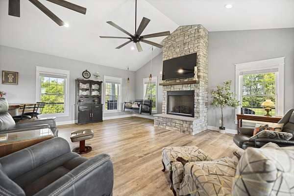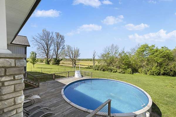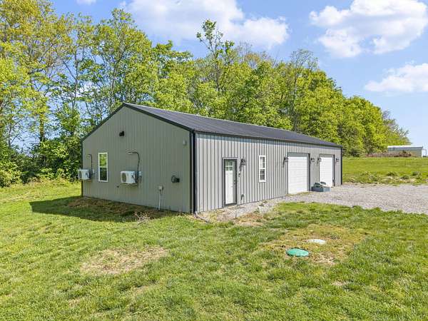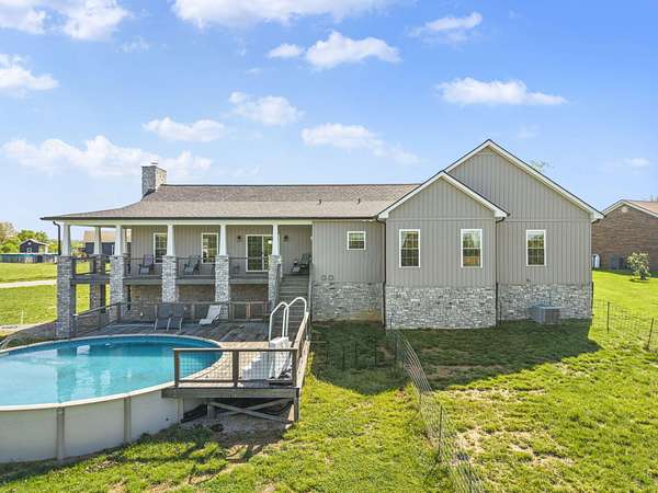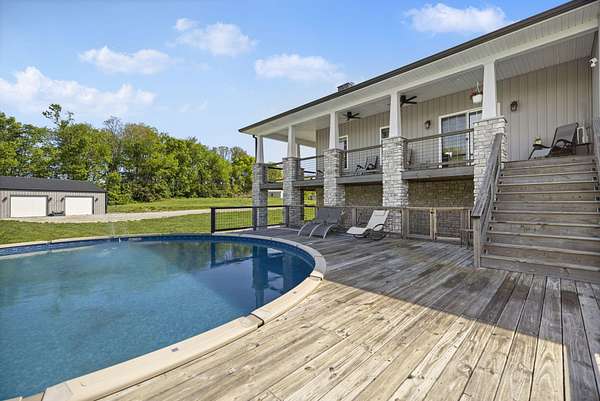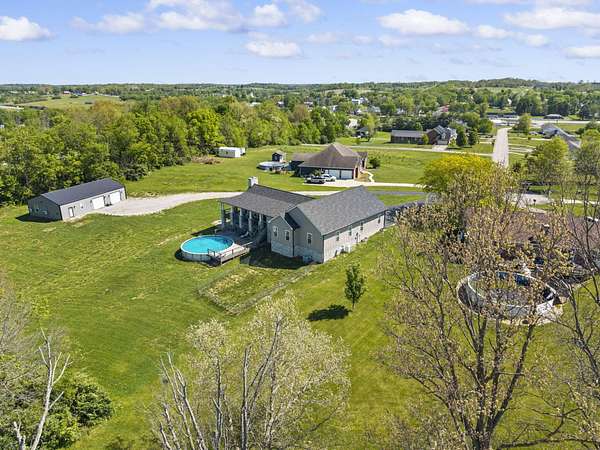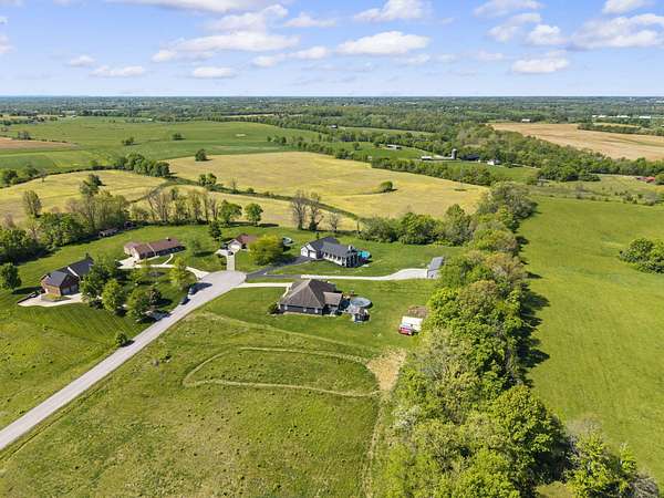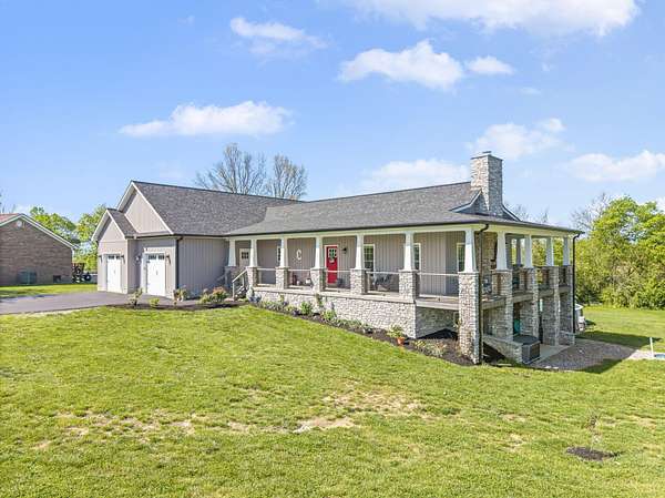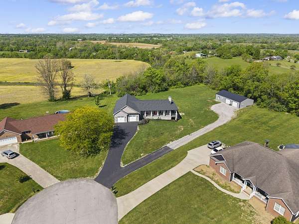 Custom-built in 2023, this private retreat offers the space, flexibility, and lifestyle many buyers are searching for. Opportunities like this-large home, basement, pool, shop, and additional living space-are increasingly hard to find at this value point. Situated at the end of a cul-de-sac and backing to farmland, the setting provides privacy, open views, and a quiet, rural feel while remaining within 30 minutes of Lexington. The 3-bedroom, 3.5-bath home features a spacious layout designed for everyday living and entertaining, including a large main living area with propane fireplace and a covered wraparound porch with outdoor fireplace-ideal for year-round use with both sunrise and sunset views. Custom finishes, including stonework and a bourbon-inspired bathroom with barrel accents, add a distinct Kentucky touch. The walkout basement includes a full bath and second fireplace, offering excellent potential for additional living space, recreation, or guest quarters. Outdoor amenities include a pool with surrounding deck, hot tub, and beautifully landscaped grounds. A standout feature is the detached 2-bay garage with 220 service and a 1-bedroom, 1-bath apartment-well-suited for multigenerational living, guest accommodations, or short-term rental/Airbnb use. The attached garage provides convenient 2-car parking for the main home. Located just minutes from the Bluegrass Parkway and a short drive to Lawrenceburg, this property offers a rare combination of privacy, convenience, and versatility-ideal for buyers seeking more space, income potential, and a slower pace without giving up access to the city.